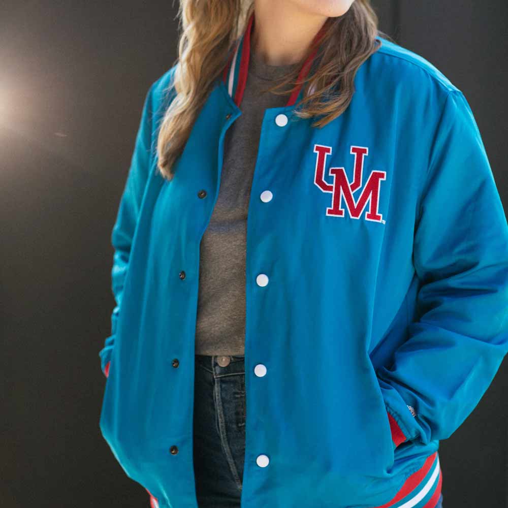Introducing our versatile Script Ole Miss Jacket, a unisex fashion essential suitable for all genders. Crafted from lustrous satin material, this jacket exudes both style and comfort. The Viscose lining ensures a luxurious feel against the skin, enhancing the overall experience. Available in a captivating blue hue, this jacket stands out effortlessly. The snap tab buttoned closure on the front provides a seamless and stylish look, complemented by the rib-knitted striped collar, cuffs, and waistband for a sporty touch. Fine stitching reflects the jacket’s quality craftsmanship. Designed for functionality, it features two waist pockets for added convenience. Embrace nostalgia with the Ole Miss Vintage-Inspired logo adorning the front and back, adding a touch of retro charm to this contemporary piece. Elevate your wardrobe with this iconic Ole Miss Vintage-Inspired Script Bomber Jacket, combining timeless design with modern flair.