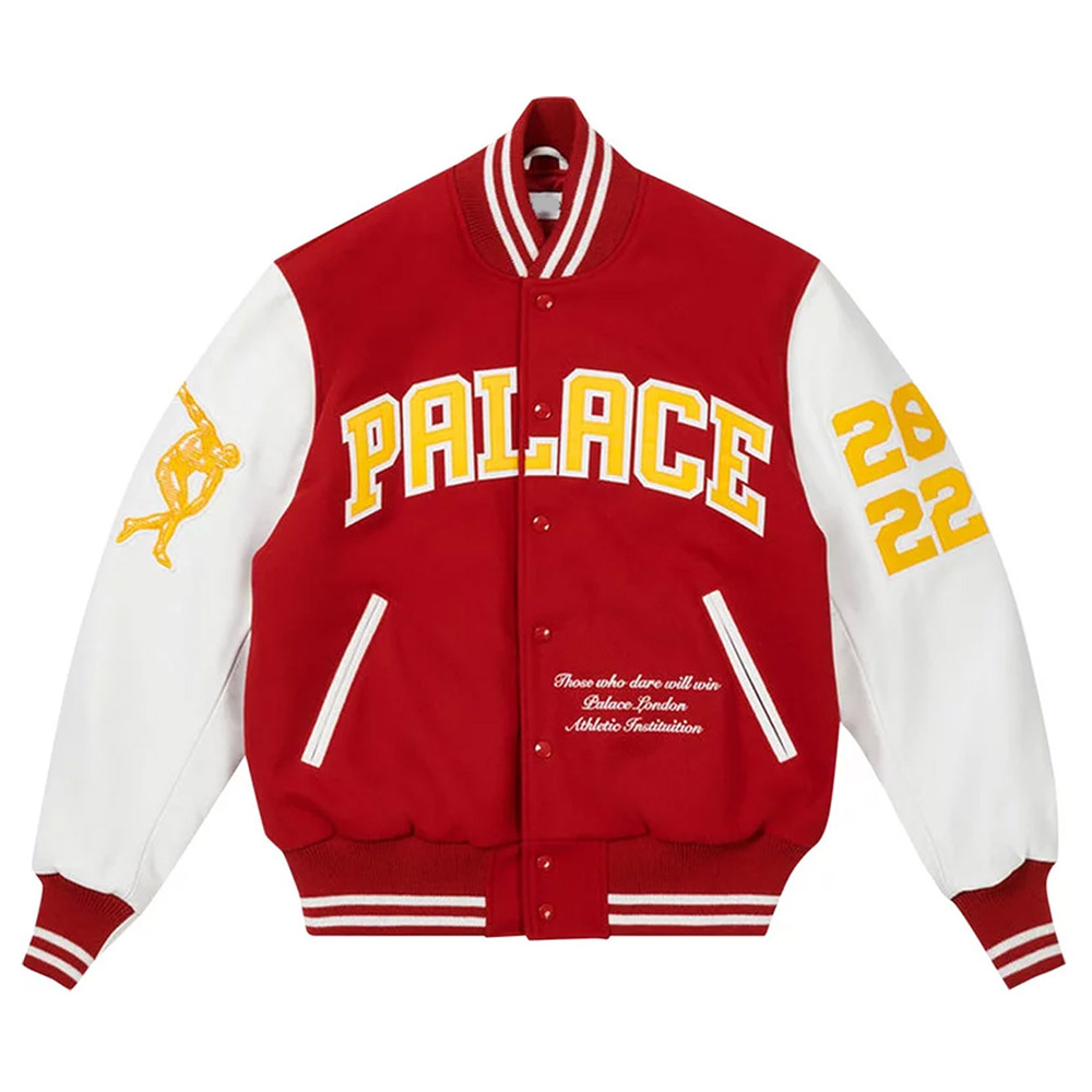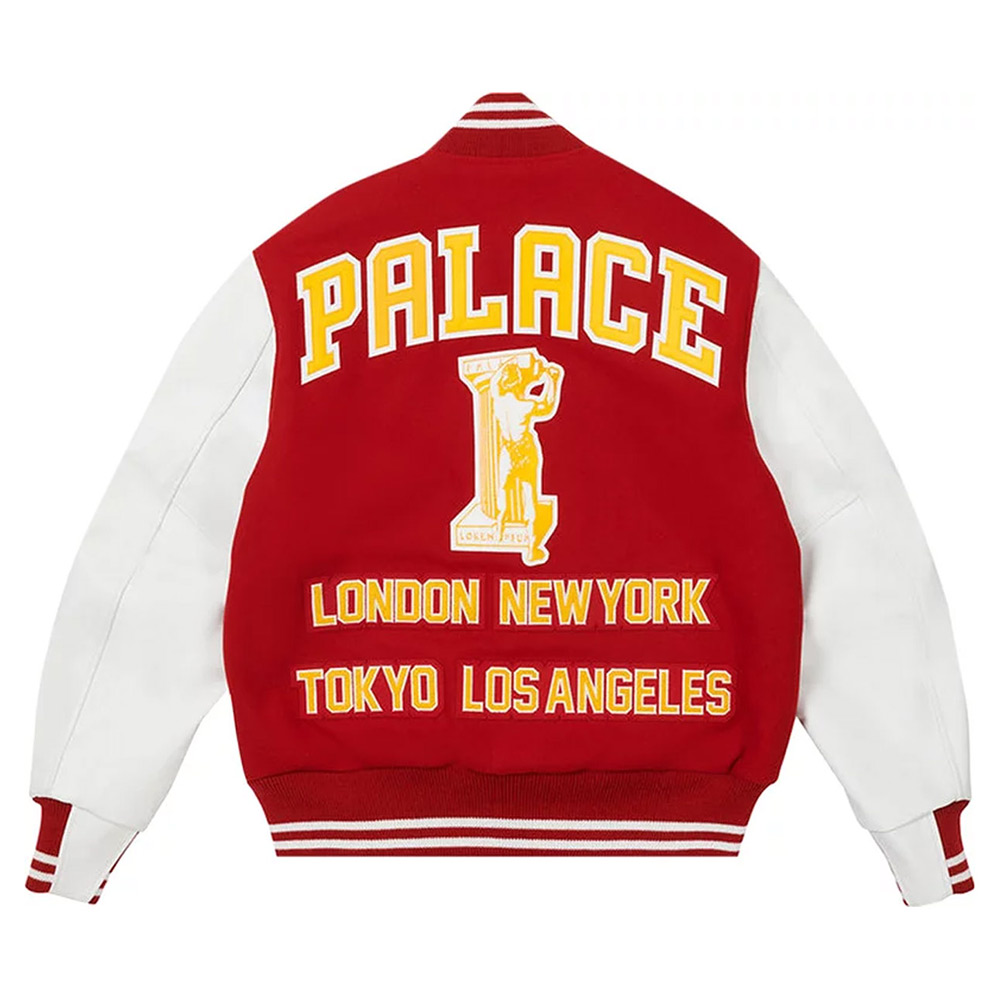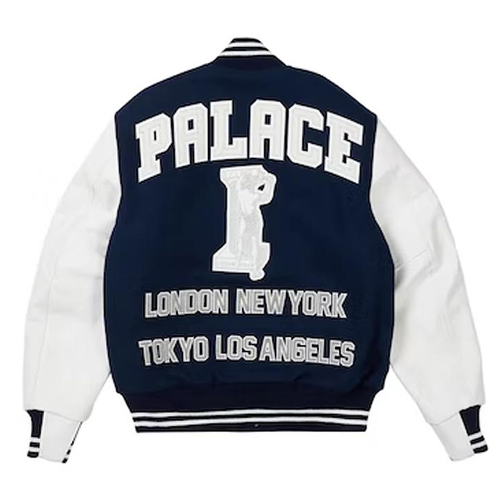 The Palace Greek Varsity Jacket, meticulously crafted from fine wool and adorned with genuine leather sleeves. Presented in two captivating combinationsnavy blue & white, and red & whitethis jacket captivates with its allure. The Palace Letterman Jacket showcases a rib-knitted collar and front buttoned closure, fusing comfort with style. Adorning the front, back, and sleeves, the logos infuse a chic touch. Wrapped in a soft viscose lining, the inner cocoon envelops you in comfort. The elongated, well-fitted sleeves, accompanied by rib-knitted cuffs, assure a sleek silhouette. For functionality and elegance, two side waist pockets seamlessly blend utility with flair. Meticulous stitching ensures the jackets enduring quality. A favored choice among the stylish, the Palace Greek Varsity Jacket embodies sophisticated taste for both men and women.