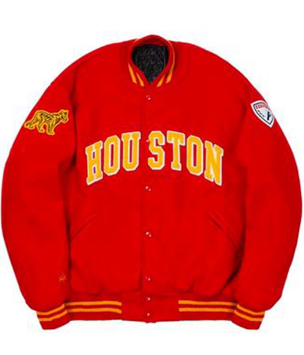 The Palace Houston Ebbets varsity jacket is made from high-quality wool. The jacket is available in a glorious red color, which gives it an innovative and bright look. The collar of the jacket is a rib-knitted style. It has a classic snap tab buttoned front closure. A soft viscose inner lining of the jacket keeps you warm and relaxed. The sleeves of the Whitney Houston red varsity jacket are full-length ends with rib-knitted cuffs. The jacket has two side waist pockets for keeping stuff. The fine quality stitching of the Palace Houston Ebbets varsity jacket makes it durable and comfortable to wear. The jacket is an ideal choice for stylish men.