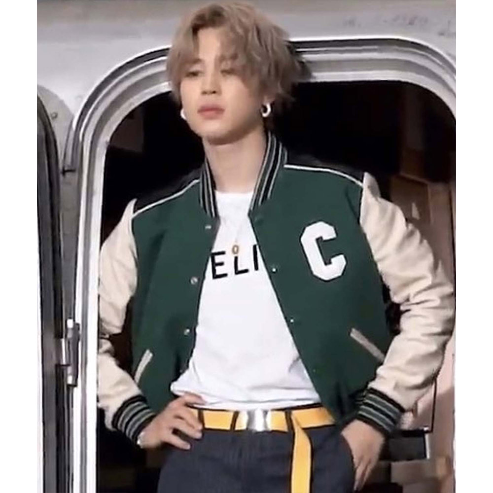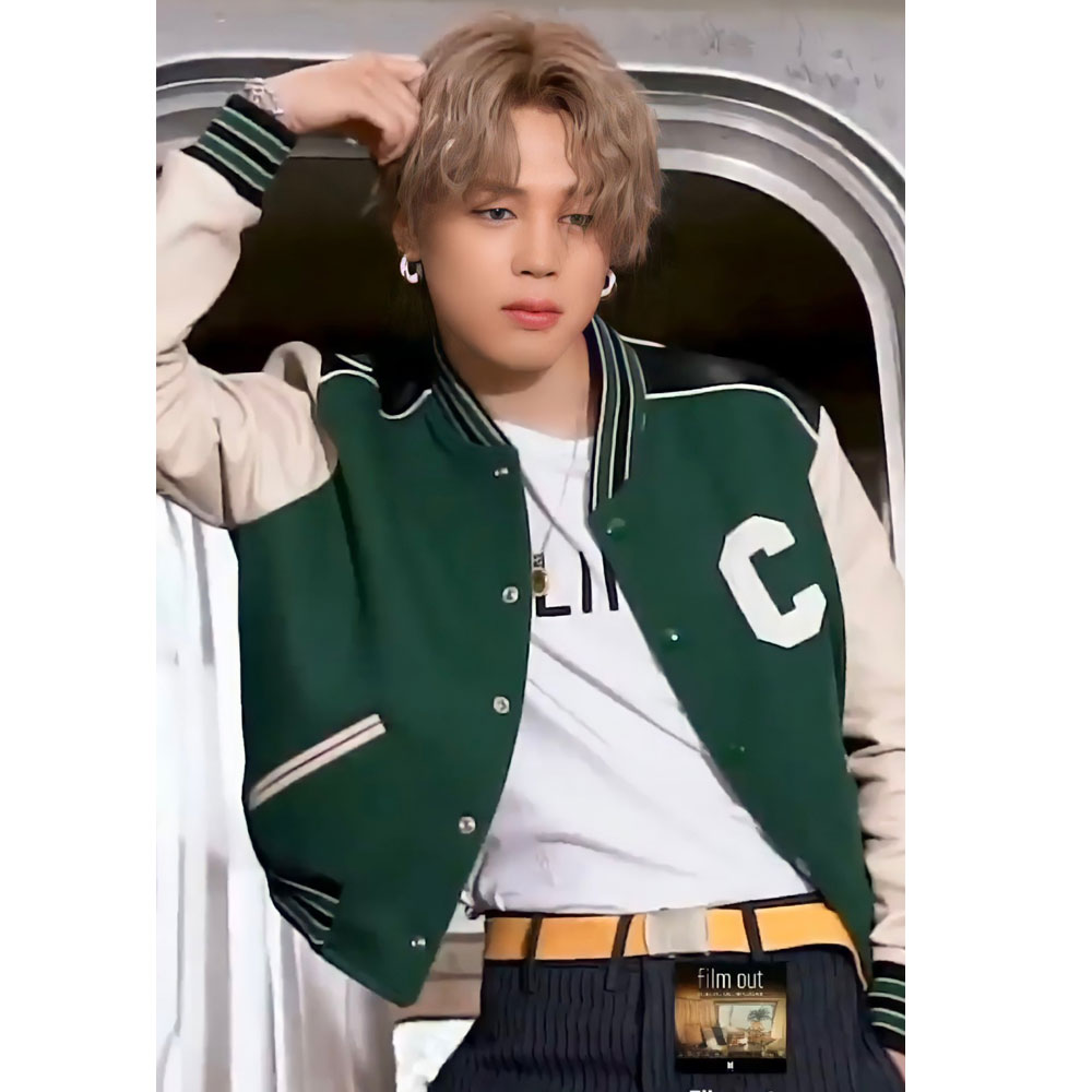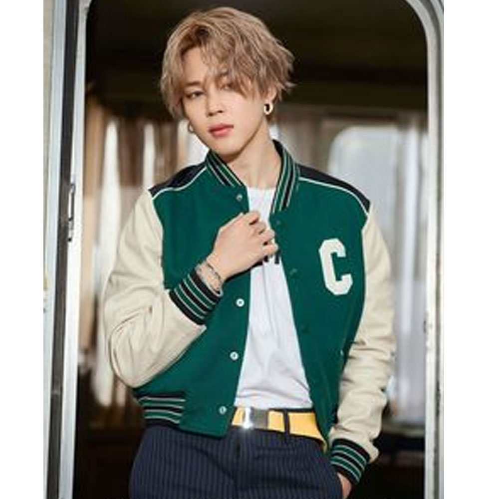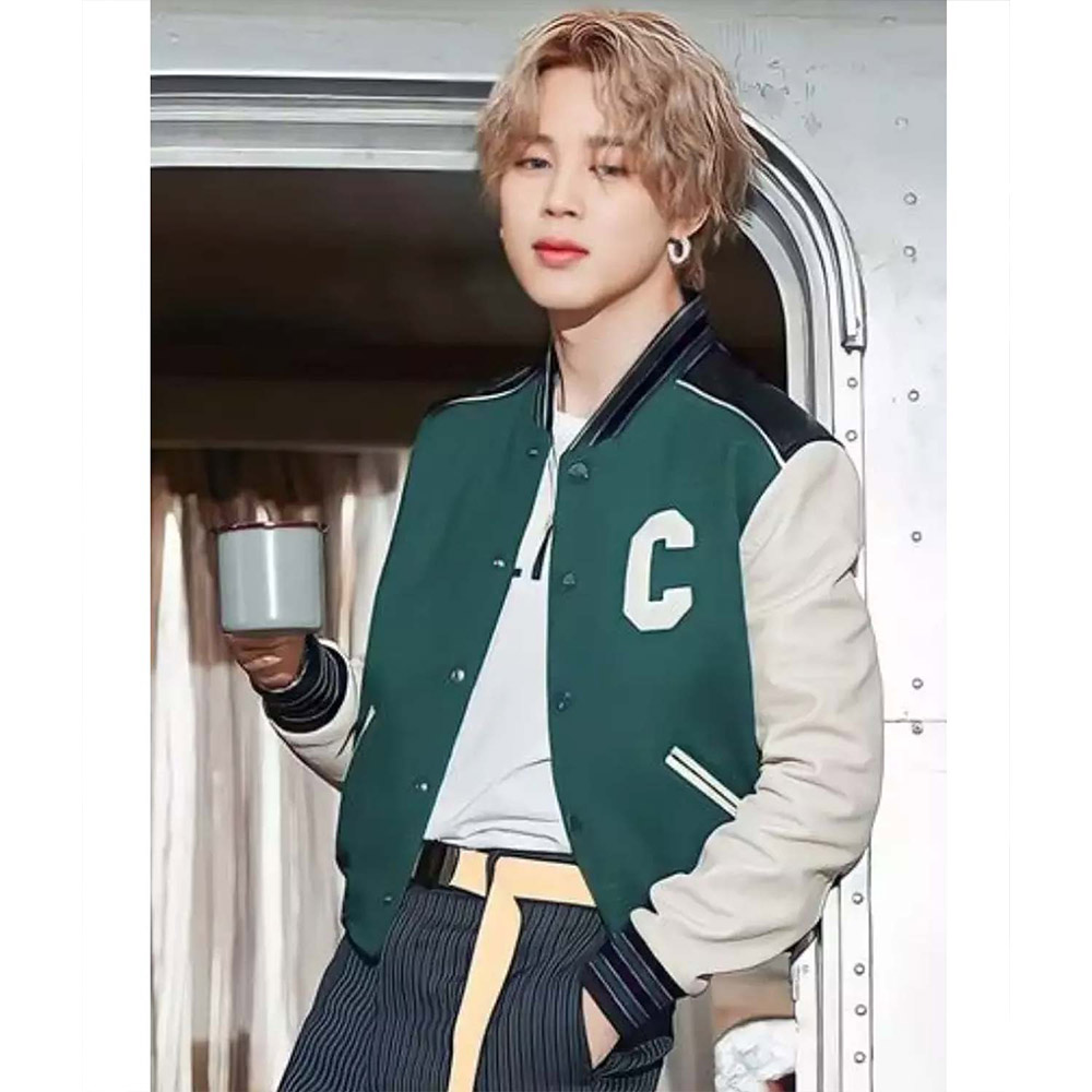 Park Jimin Green and White C Letterman Wool/Leather Jacket