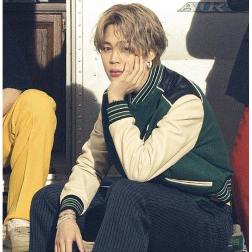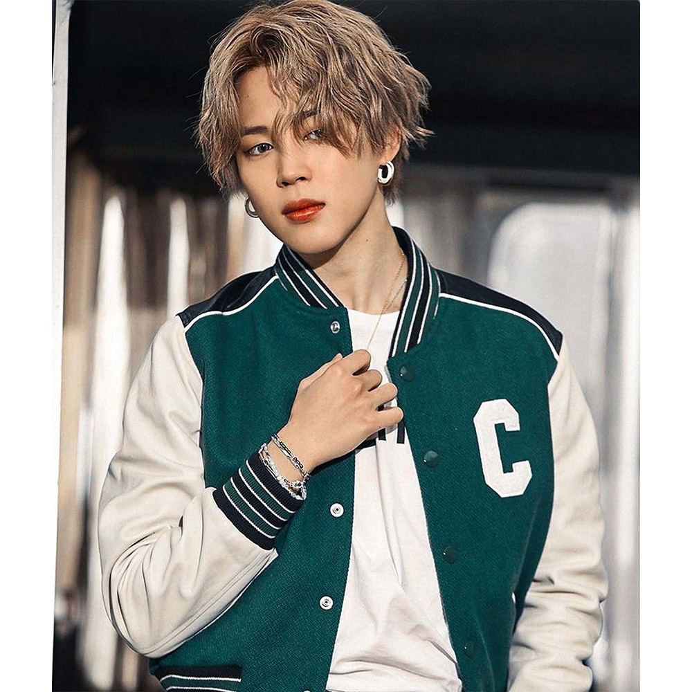 Experience the iconic Park Jimin Green jacket Crafted body from wool and sleeves from genuine leather. Majestic green color for an innovative and enchanting look. Rib Knitted collar adds a touch of sophistication. Features a buttoned front closure. Stay warm and relaxed with the soft viscose inner lining. Long sleeves with rib knitted cuffs for a stylish appeal. Stay organized with two inside pockets. Fine quality stitching of Park Jimin Varsity jacke sures durability and comfort. Perfect for parties and nights out with friends. Embrace Park Jimin legendary style with this unique and captivating jacket.