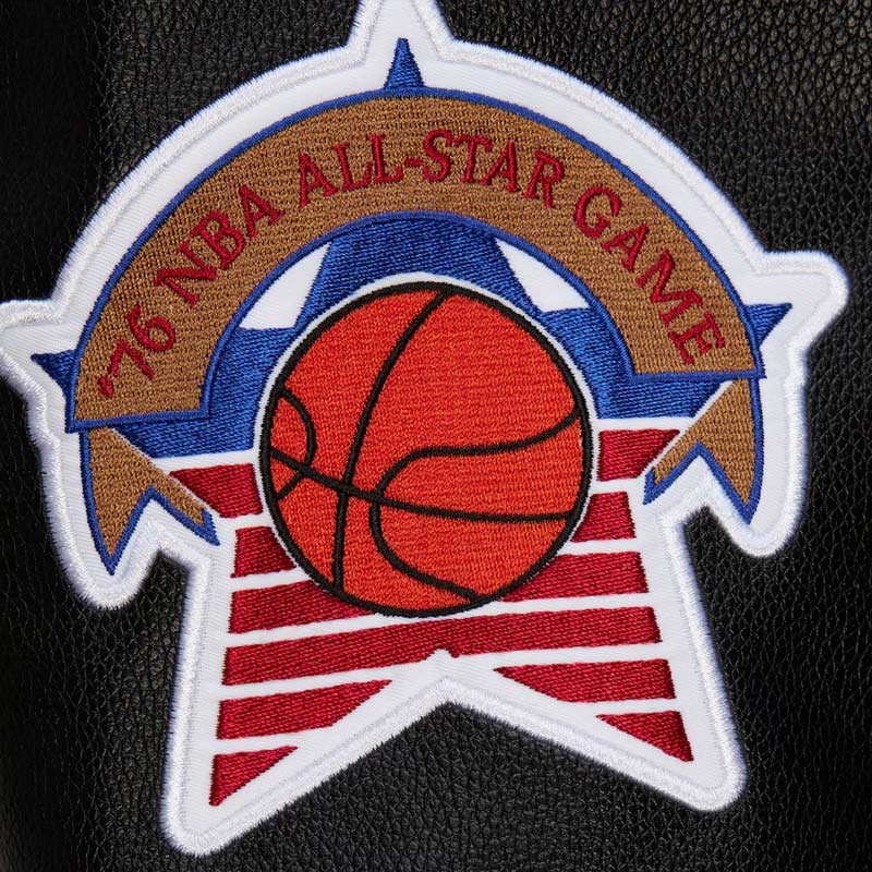 The collar is ribbed and there is a snap tab closure at the front to ensure practicality. The long sleeves themselves are enhanced with detailed patches that give a special design to the piece. The Philadelphia 76ers Black Out Team Logo Varsity Jacket has ribbed cuffs and a matching hem to provide a close silhouette to the body and comfort during training.