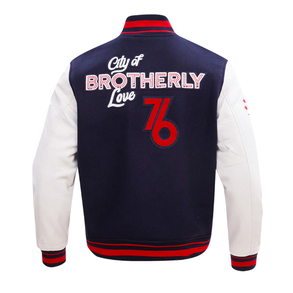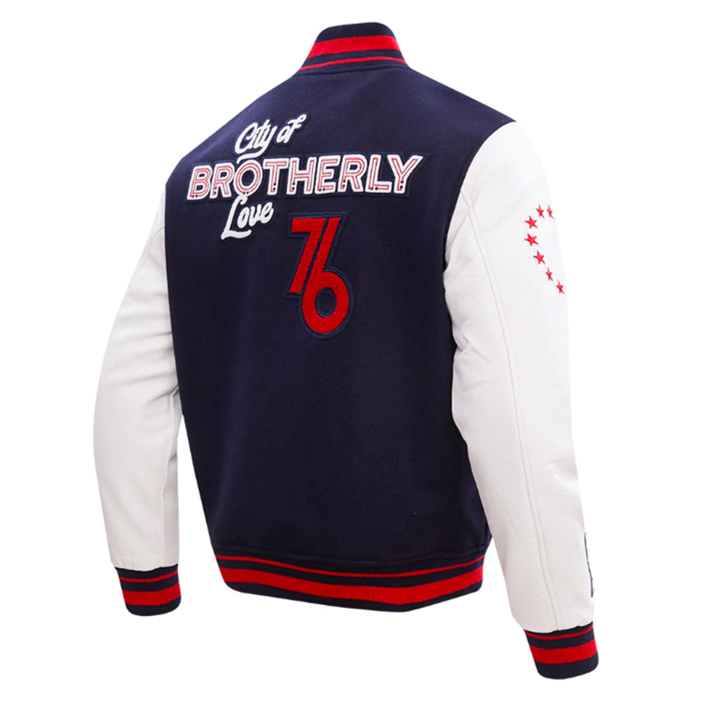 Take the Philadelphia 76ers City Edition Navy Varsity Jacket to the next level on game day. Cut for any gender, this jacket reflects the vibe of traditional varsity wear, but is modernized and proudly displays your allegiance to the mighty basketball team. Constructed with a wool body and having real leather sleeves and is comfortable and can be expected to last longer. Tailored in the navy and white colors, it is styled with a stand-up collar and has rib-knitted cuffs and hemline to enforce the classy varsity aesthetic. The front features a button over zipper fastening, which makes wearing the item comfortable, the long sleeves include patches, giving the Philadelphia 76ers City Edition City of Brotherly Love Varsity Jacket a vintage touch. A viscose lining are used inside in order to make it as comfortable as possible.