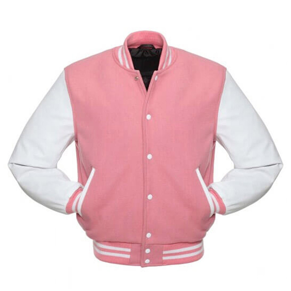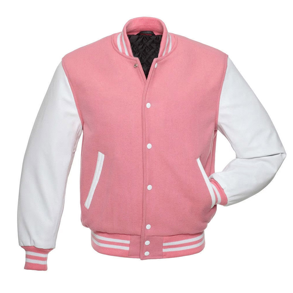 Introducing the Pink and White Varsity jacket crafted body made wool and sleeves made from genuine leather. Combination of white and pink color for an innovative and attractive look. Rib-knitted collar adds a touch of style. Classic snap tab buttoned front closure for a timeless appeal. Stay warm and relaxed with the soft viscose inner lining. Full-length sleeves with fitting and rib-knitted cuffs for a sleek look. Two side waist pockets of Pink Varsity jacket with White Leather sleeves is for convenience. Fine quality stitching ensures durability and comfort. Embrace this unique and catchy, yet leek and alluring piece that sets you apart from the crowd. Experience the perfect blend of Introducing the Pink and White Varsity jacket style and comfort, maintaining its length for an impeccable fit