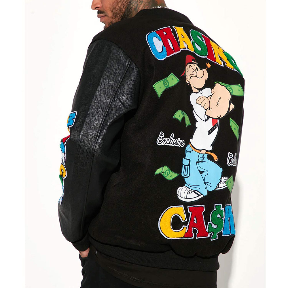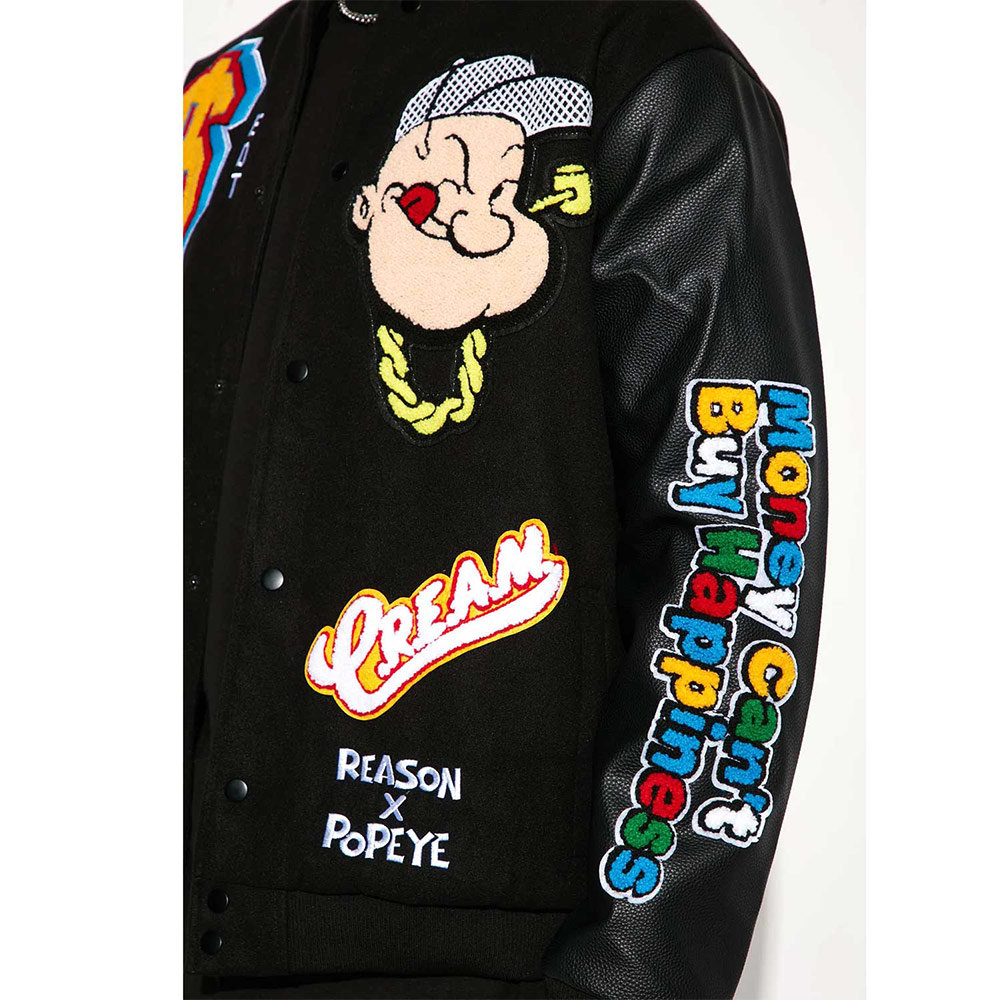 What truly makes this piece stand out is the chenille Popeye logo placed on the front, sleeves, and back. This textured design element adds a playful yet iconic vibe, symbolizing the fun and energy of the beloved cartoon character. It elevates the Popeye Varsity Jacket from a simple outfit to a statement piece.