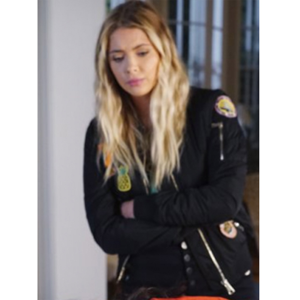Step into the intrigue of ‘Pretty Little Liars’ Season 7 with the Marin Bomber Jacket, a satin masterpiece that embodies the essence of Ashley Benson’s character, Hanna Marin. This black bomber showcases a round-neck collar, rib-knitted cuffs, and meticulous stitching throughout for a tailored fit. The zipper closure adds a contemporary flair, while the viscose lining ensures lasting comfort. Express your individuality with multiple patches on the front and sleeves, giving this jacket a truly unique style. Practicality meets fashion with one zipper pocket on the sleeve and two waist pockets, both inside and out. The Marin Bomber Jacket is a fusion of style and functionality, epitomizing the spirit of ‘Pretty Little Liars’ Season 7.