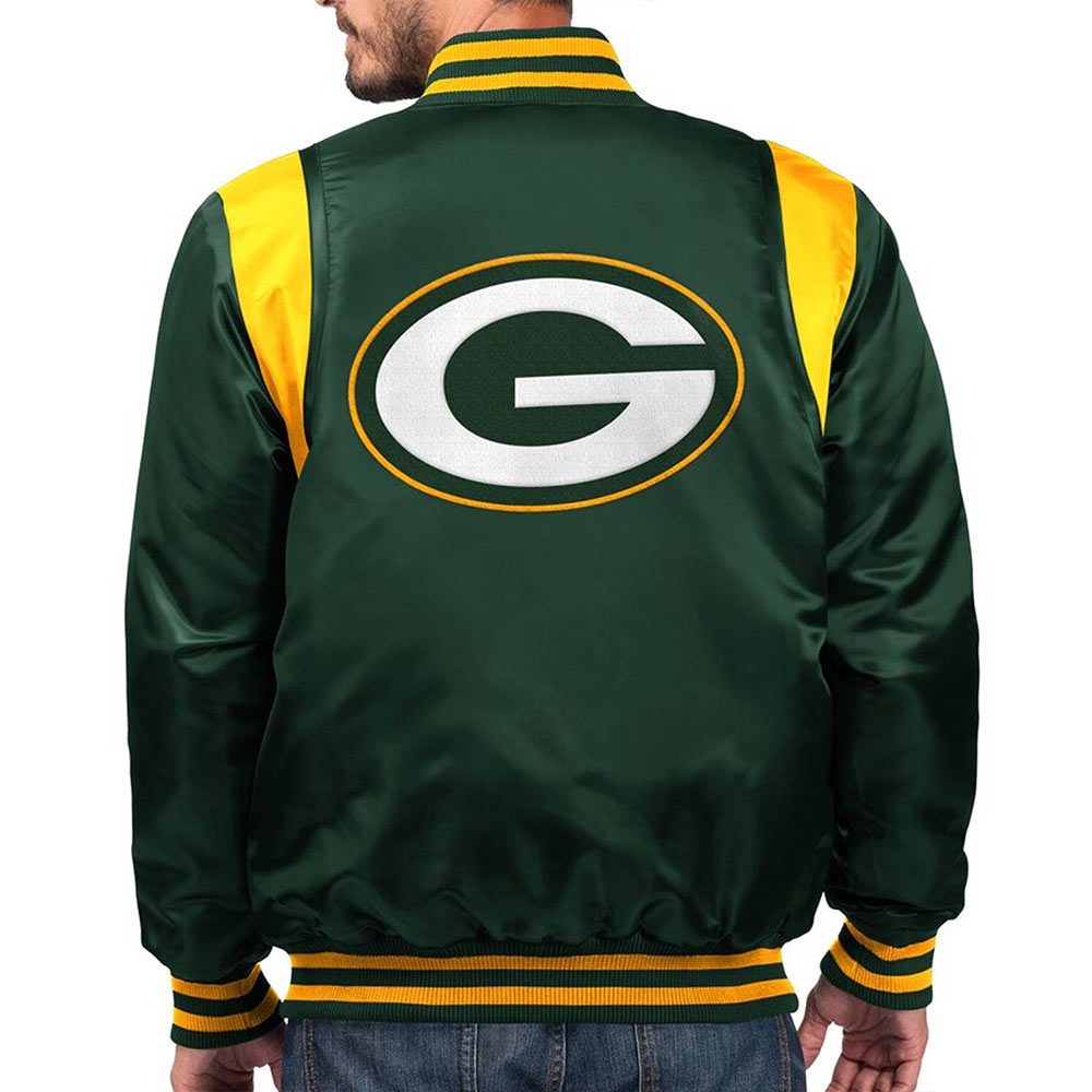 The Green Bay Packers Prime Time Satin jacket is made up of high-quality satin. The jacket is available in a majestic green color, which gives it an innovative and enchanted look. The jacket has shirt style collar. The jacket has branded YKK zipper front closure. A soft viscos inner lining of the jacket keeps you warm and relaxed. The sleeves of Prime Time Green Bay Packers Green Satin jacket are long with rib knitted cuffs. The jacket has two inner and two side pockets. The fine quality stitching of Green Bay Packers Prime Time Satin jacket is comfortable and desirable to wear. The jacket is an ideal choice to wear in parties.