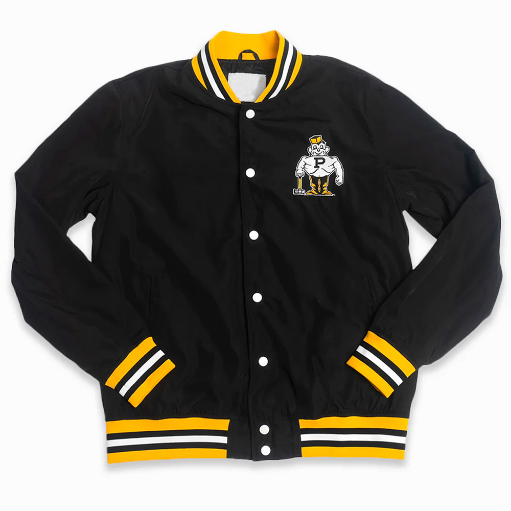 Introducing our versatile and stylish Vintage Pete Purdue Boilermakers Jacket, a wardrobe essential suitable for all genders. Crafted from high-quality satin material, this jacket offers a luxurious feel and a sleek appearance. The Viscose lining ensures comfort, making it an ideal choice for various occasions. Available in a timeless black color, this jacket seamlessly blends with any ensemble. The snap-tab buttoned closure adds a touch of sophistication to the front, complemented by the rib-knitted striped collar, cuffs, and waistband for a sporty yet refined look. Meticulously stitched for durability, the jacket features two convenient waist pockets for practicality. The standout element is the Purdue Boilermakers Vintage Pete logo proudly displayed on the front and back, adding a touch of collegiate charm. Elevate your style with this meticulously crafted Purdue Boilermakers Vintage Pete Black Jacket, combining fine craftsmanship with a nod to iconic sports heritage.