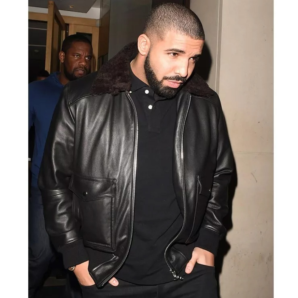 The best feature of Rapper Drake Black Leather Bomber Jacket is the shirt-styled fur collar that gives it a class and comfort. The front zipper closure complemented by a snap placket makes for both the fashion and functionality. Shoulder straps add some attitude to the design and make it perfect to stand out from the crowd.