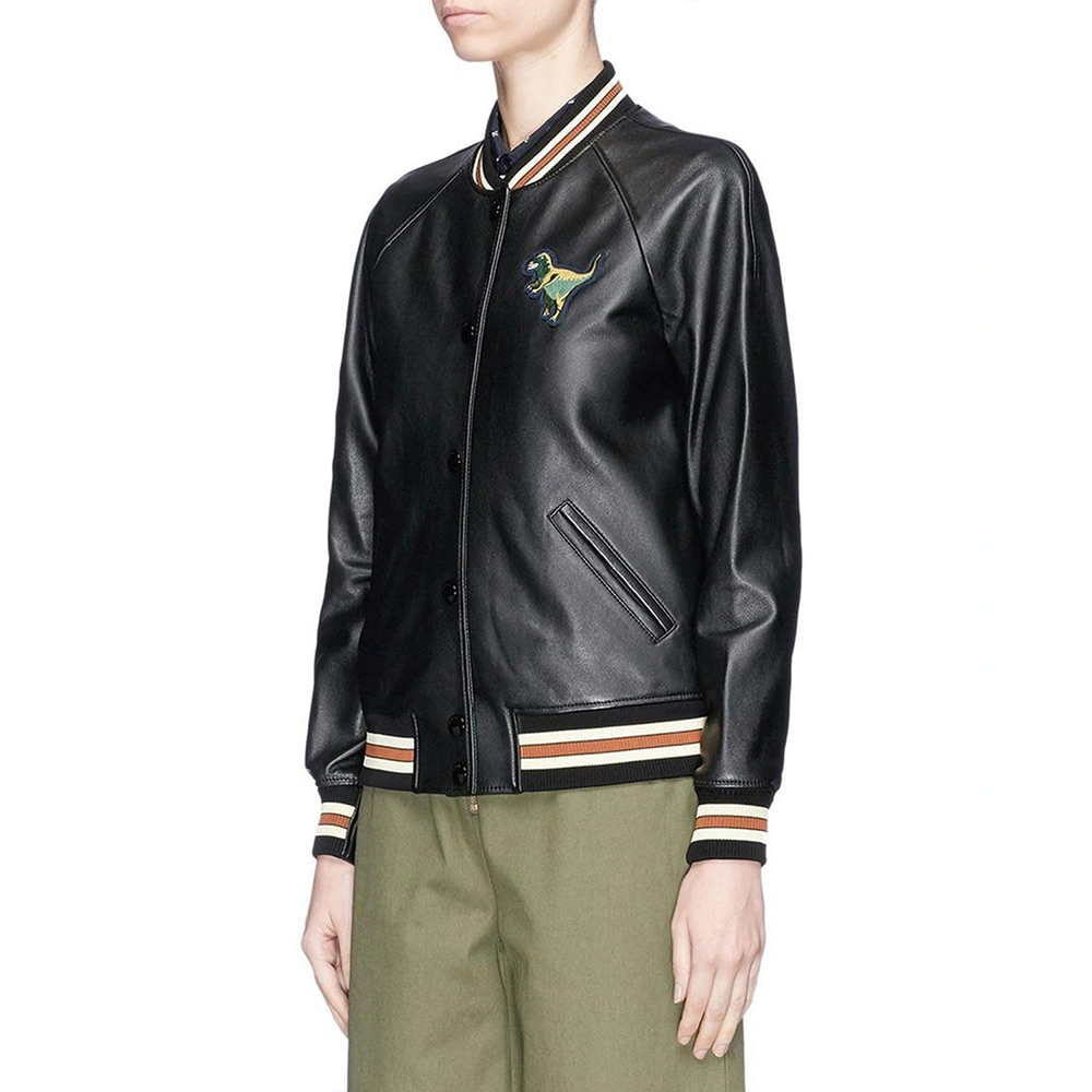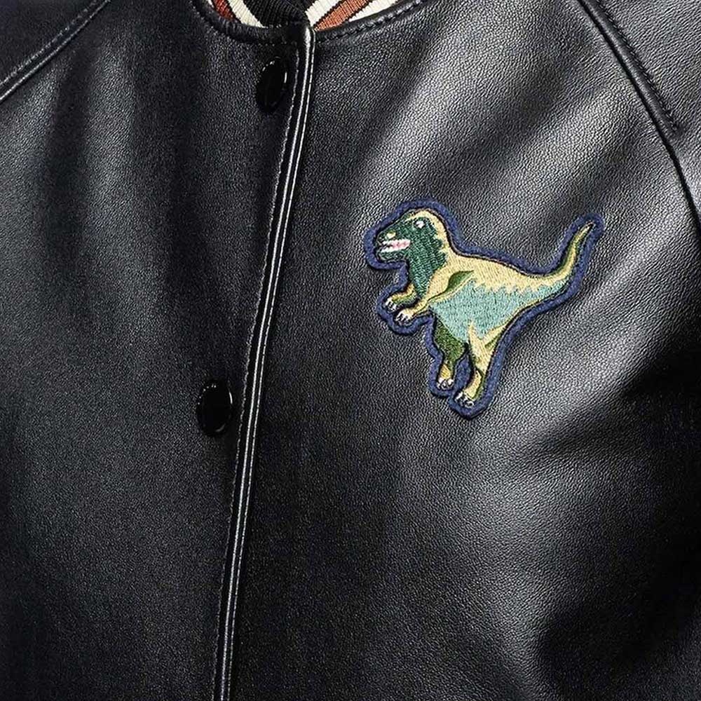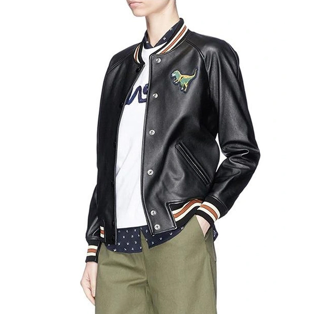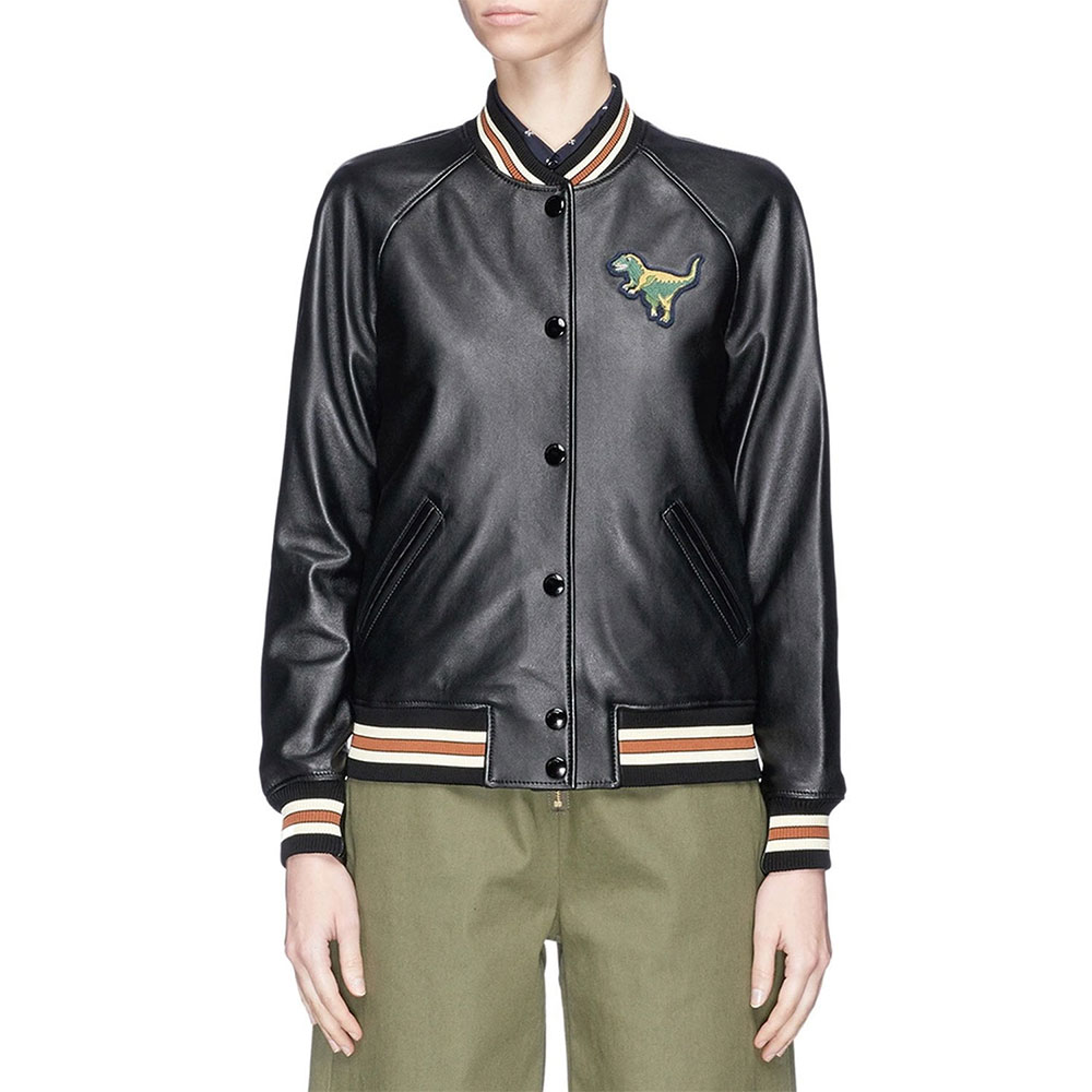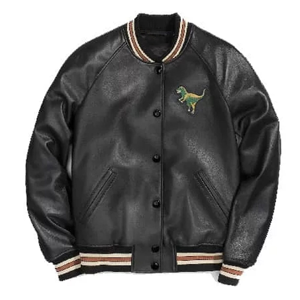 Unleash a blend of luxury and urban edge with the Black Leather Coach Rexy Varsity Jacket. For the modern trendsetter, this iconic piece showcases the playful Rexy dinosaur design on premium leather. The Rexy varsity leather jacket silhouette adds a sporty touch, making it a versatile statement piece for any occasion. Even if you’re exploring the city or attending a casual event, this jacket is an emblem of Coach’s signature style and your unique personality. Model your wardrobe with a touch of high-end streetwear, where sophistication meets playful charm. it’s an expression of urban elegance and fashion-forward sensibility that stands out in every crowd.