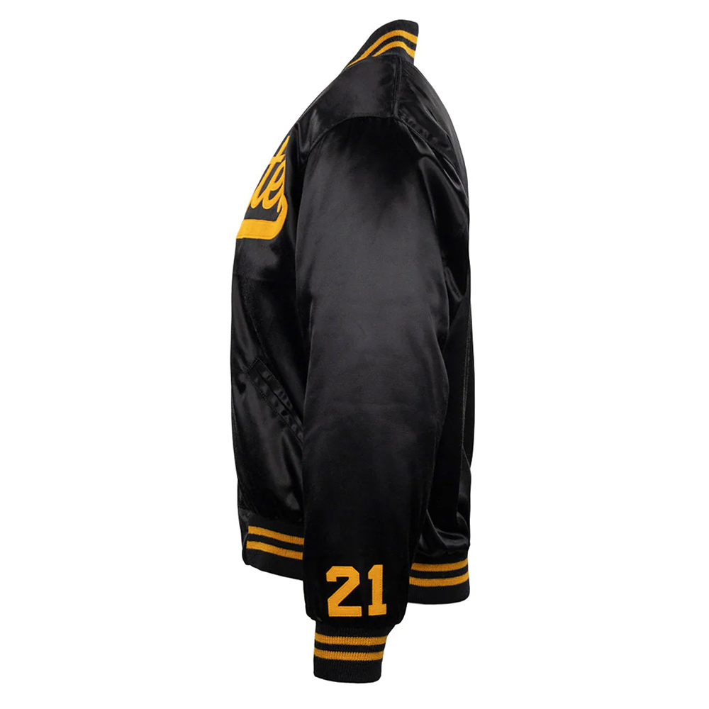 One unique feature of the Roberto Clemente 1970 Jacket is that it is made of satin fabric which makes it shiny and attractive especially when made from a black color. The base material with the internal layer being soft viscose gives a very comfortable and warm feel that makes it suitable for use in different climates.