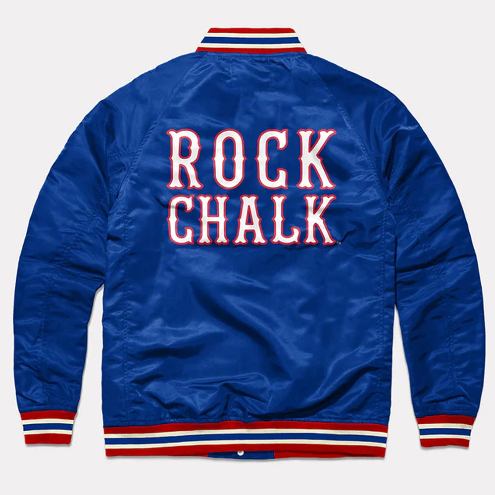 Embrace the legacy of excellence with the iconic Kansas Jayhawks Rock Chalk jacket. Meticulously tailored from premium satin, its glorious blue color exudes innovation, casting a captivating allure. The rib-knit collar and snap-tab buttoned front closure seamlessly fuse function with haute couture, redefining your style expression. Envelop yourself in the embrace of luxurious viscose inner lining, cocooned in opulent comfort. Elongated sleeves, adorned with sleek rib-knit cuffs, elevate your grace to extraordinary heights. Enhanced with an inner pocket and two outer pockets, the Rock Chalk Kansas Jayhawks Blue jacket epitomizes practical elegance. Revel in unparalleled comfort and allure, as meticulous stitching pays homage to impeccable craftsmanship. A symbol of sophisticated gatherings, this jacket embodies your dynamic spirit, setting a fresh benchmark for trendsetting brilliance.