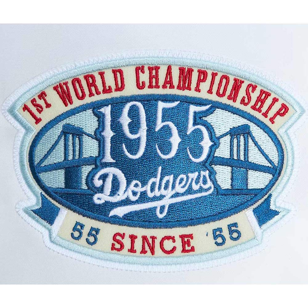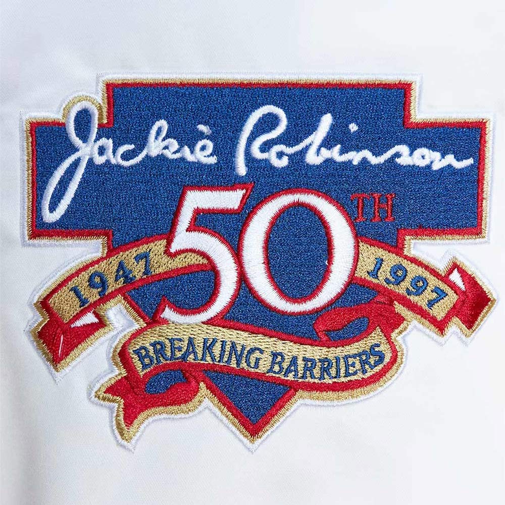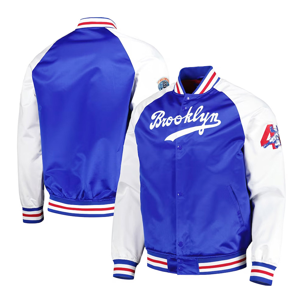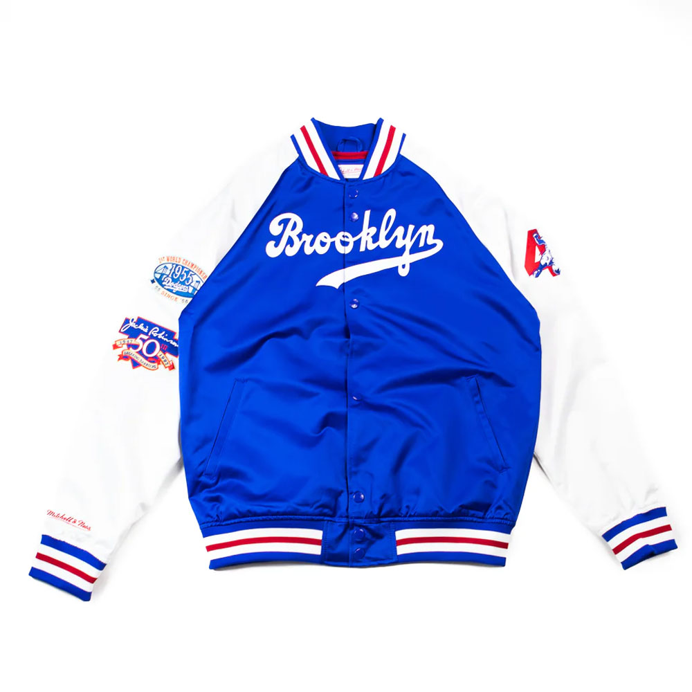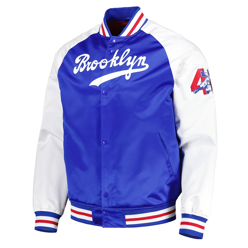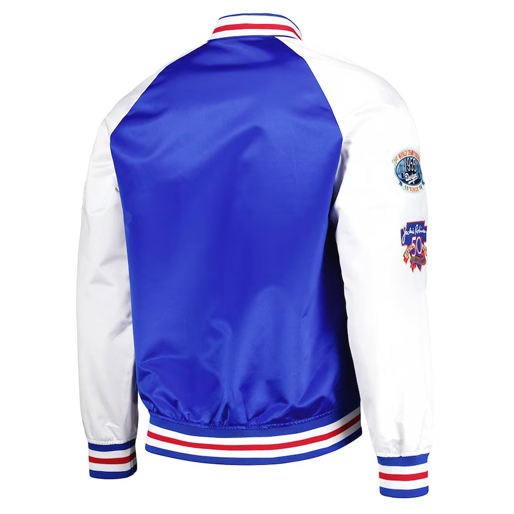 Embrace the allure of the Jackie Robinson Brooklyn Dodgers jacket, meticulously crafted with high-quality satin. Its captivating white and royal blue color combination brings forth an innovative and attractive aesthetic. Sporting a rib knitted collar and buttoned front closure, this Brooklyn Dodgers Jackie Robinson Legends Royal and White jacket seamlessly blends style and functionality. The soft viscose inner lining ensures warmth and relaxation. With long sleeves adorned with rib-knitted cuffs, a comfortable and sophisticated fit is guaranteed. The Jackie Robinson Brooklyn Dodgers jacket boasts two inner and two side pockets, providing ample storage options. Experience comfort and desirability with its fine quality stitching, making it the perfect choice for parties