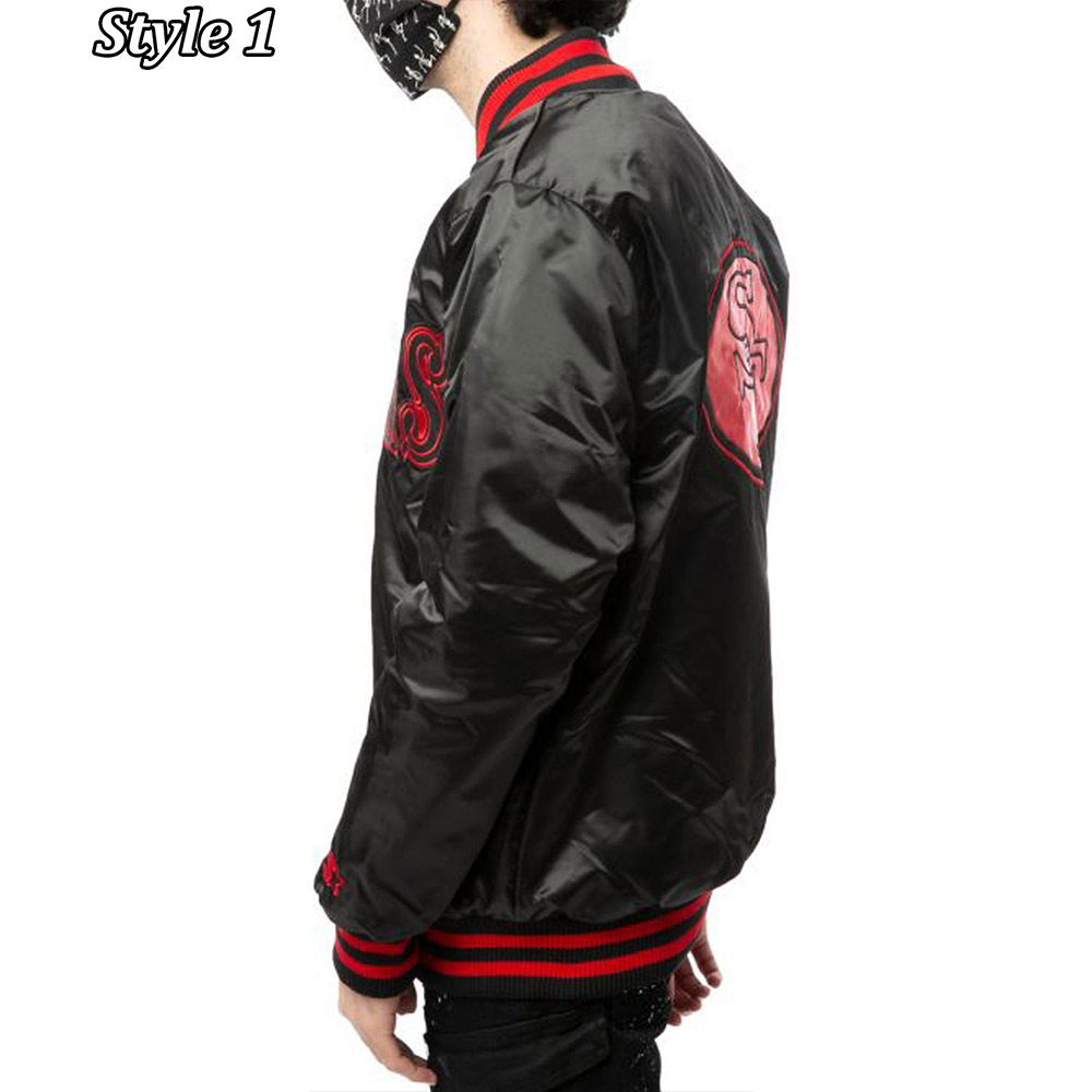 The San Francisco 49ers black jacket is made from high-quality satin. The jacket is available in a mesmerizing black color, which gives it an innovative and striking look. The jacket has a rib-knitted collar with a snap tab buttoned front closure which makes it desirable to wear. The jacket has embroidered patches on the front, back, and sleeves. A soft viscose inner lining of the jacket keeps you calm and relaxed. The sleeves of the Starter San Francisco 49ers black jacket are long and fitting with rib knitted cuffs. The jacket has two side waist pockets for keeping stuff. The fine quality stitching makes the San Francisco 49ers black jacket durable and comfortable to wear. The jacket is an ideal choice for casual wear.