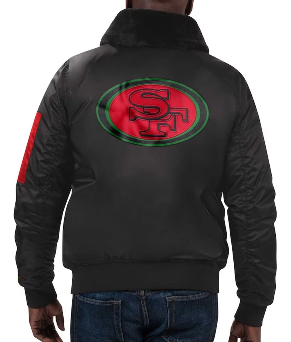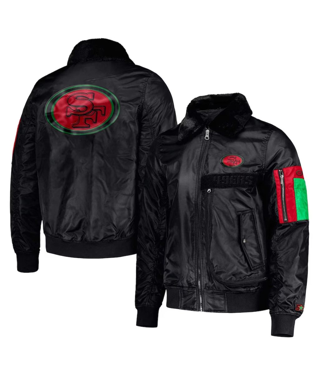 Engage in the realm of sports and style with finesse through San Francisco 49ers Ty Mopkins black history month jacket. Crafted meticulously from exquisite satin, it showcases an enticing black hue that radiates individuality. The lapel-style collar and the branded YKK front zipper closure intertwine harmoniously, ensuring a seamless marriage of elegance and confidence. Its unique design makes a resounding statement, making it an impeccable choice for animated evenings with friends. The elongated sleeves of the San Francisco 49ers Ty Mopkins black jacket are adorned with rib-knitted cuffs, strike the perfect balance between comfort and audacity. Wrapped in the plush cocoon of a viscose inner lining, warmth and serenity become your eternal companions. Meanwhile, functional waist zipper pockets and concealed inner compartments add a dash of practical elegance to house your essentials.