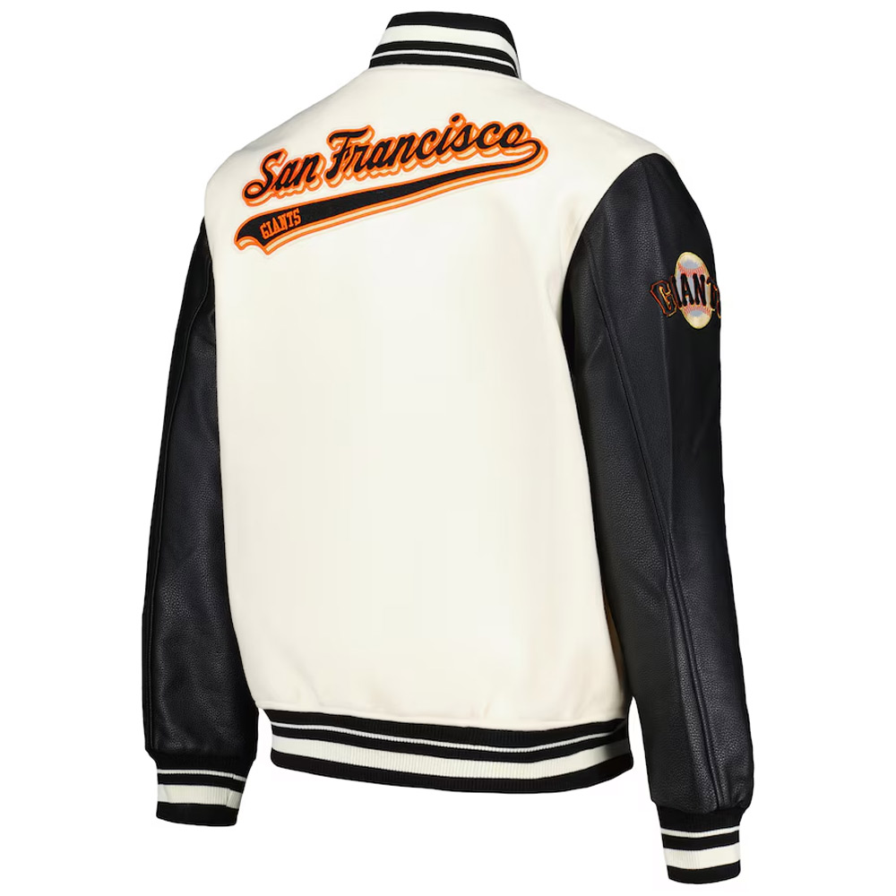 Salute your fandom for the San Francisco Giants with the San Francisco Giants Script Tail Varsity Jacket for both men and women. This premium jacket combines style and charisma with its conventional cut and cream and black colors associated with team wear. The jacket has a wool body with genuine leather on the sleeves, and it is warm and rather resistant; the lining is made of soft viscose. Some of the design features include the stand-up collar, the rib-knitted cuffs and the hemline aligns with the varsity jacket feel. Button-over-zipper closure makes this San Francisco Giants Script Tail cream and black Varsity Jacket an effective and looking one while wearing, making it flexible between novelties. The sleeves’ length is elongated and there are the patches of the teams that the characters belong to.