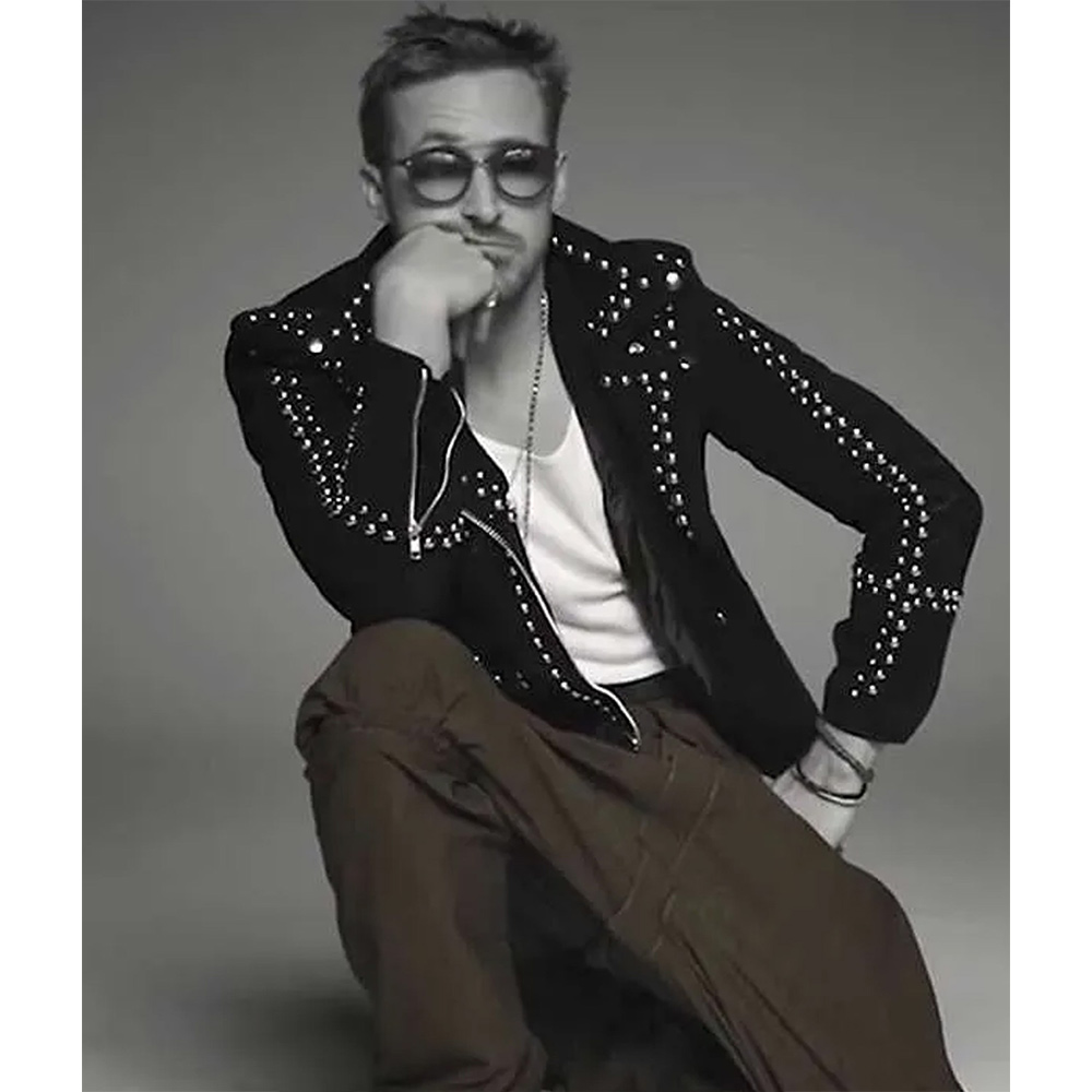 This jacket is made of high quality suede leather that has a soft viscose lining for added comfort without adding any bulk. The entire Saturday Night Live Ryan Gosling studded jacket is of black color and the silver studs that are placed all along the jacket make it look more like a Rock star.