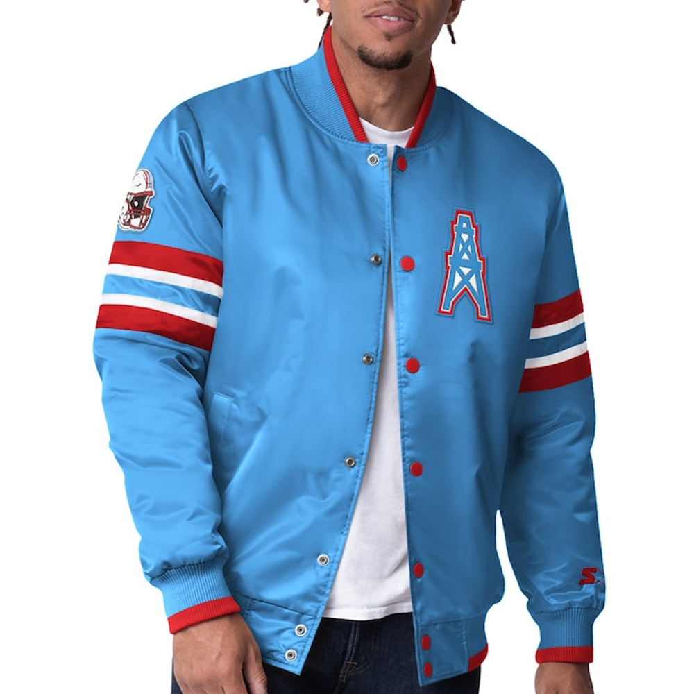 Upgrade your game day fashion and support your favorite football team with the Houston Oilers Scout I Jacket. This jacket is unisex and comes with a light blue satin shell and a viscose lining that makes it strong yet comfortable. Whether you are watching the game live in the stand or just want to display your Oilers pride in public, this jacket is perfect for you.