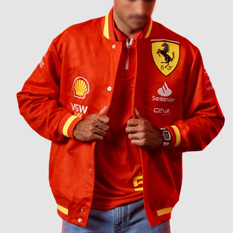 Your racing spirit will thrive when you wear the Ferrari Varsity Jacket which combines athletic elegance with superior manufacturing quality. It caters to fans of any gender while honoring Scuderia Ferrari which stands as a famous name within the motorsport world.