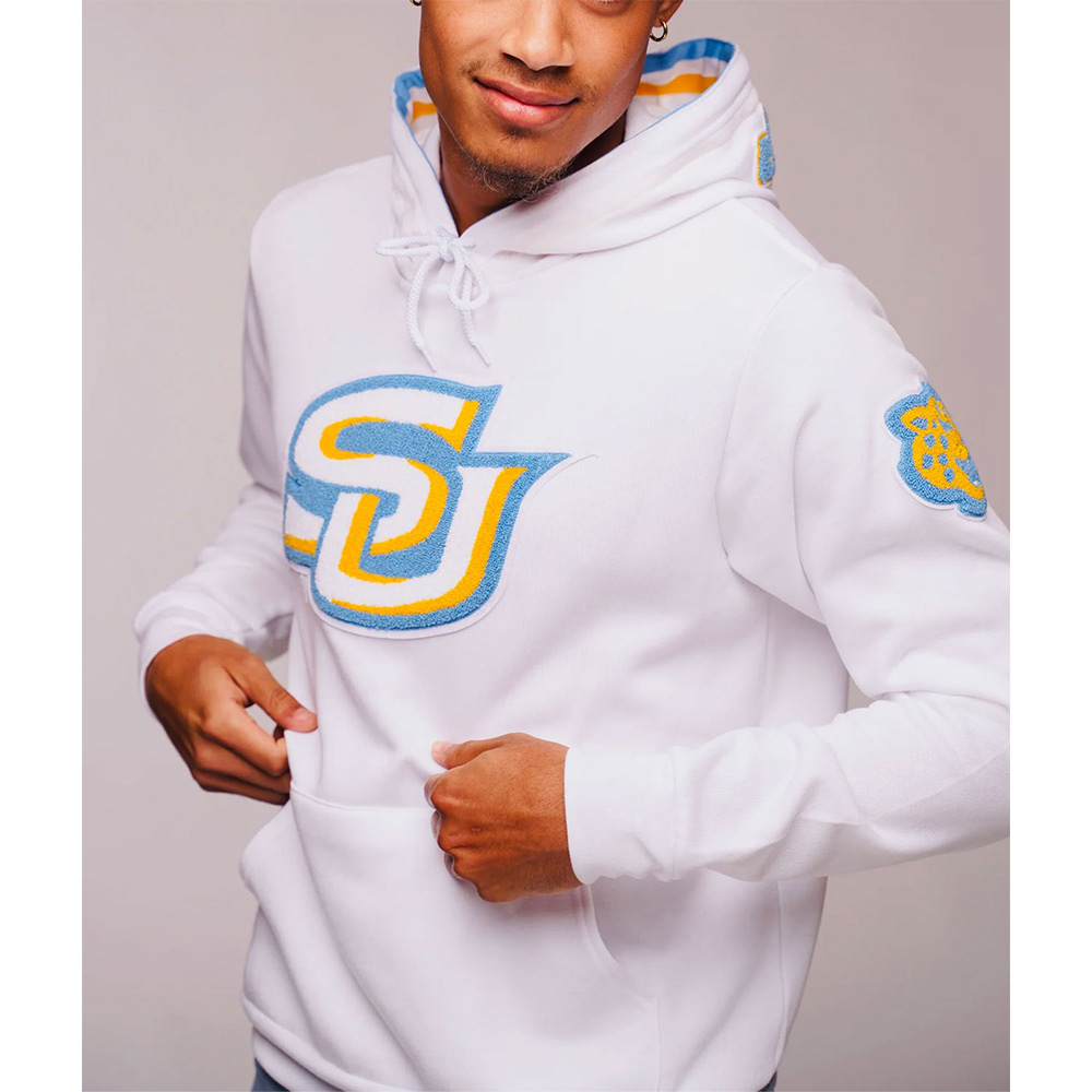 Internally, the fabric content involves viscose, so the Jaguars can comfortably wear them freely for general use or game activities. Each component of the Southern University Jaguars Letterman White Hoodie has been sewn with a fine thread, which gives the assurance of a solid material with exemplary stitching that can withstand daily drudgeries while still maintaining a neat appearance.