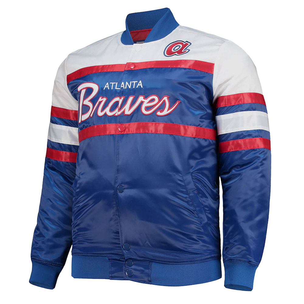 Elevate your style with the Special Script Atlanta Braves jacket, crafted from high-quality satin for a luxurious feel. Its glorious blue and white color combination adds a touch of innovation and attractiveness to your attire. The shirt-style collar and branded YKK zipper front closure exude sophistication and convenience. Stay cozy and relaxed with the soft viscose inner lining, while the long sleeves with rib-knitted cuffs provide a comfortable fit. The fine quality stitching ensures durability and comfort, making the Special Script Atlanta Braves Coaches Satin jacket an ideal choice for sports day or any casual occasion. Embrace your team spirit with this stylish jacket and make a statement wherever you go.