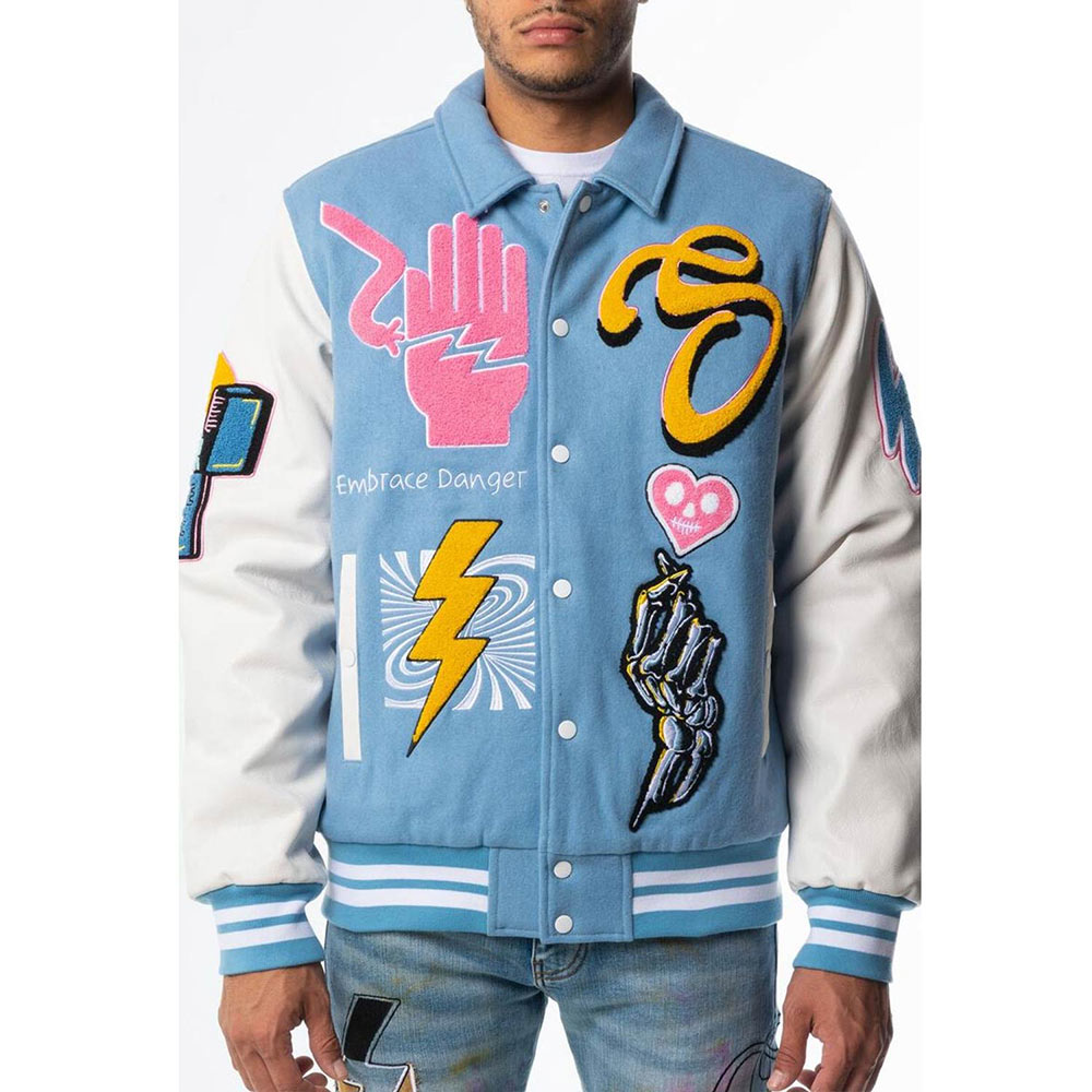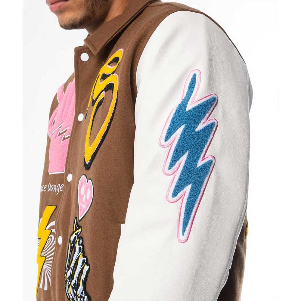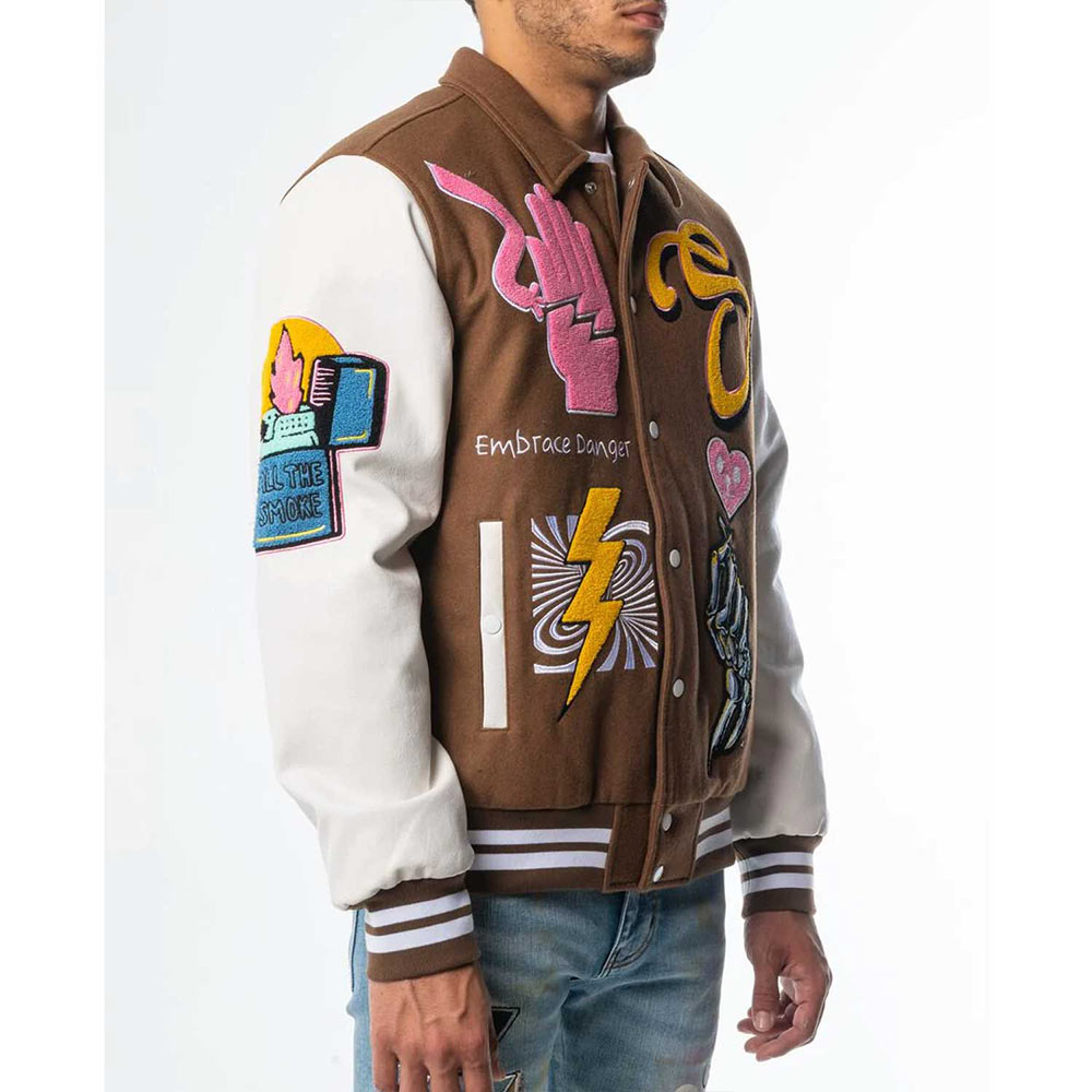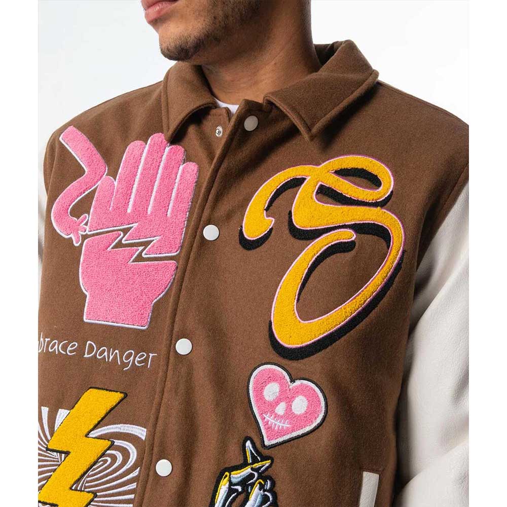 Introducing our Danger Letterman Jacket, a timeless piece suitable for all genders. The jacket seamlessly blends style and comfort with a body crafted from premium wool and sleeves made from genuine leather, providing durability and sophistication. The Viscose lining ensures a luxurious feel against the skin. Available in three stylish color combinations – blue with white, tan with white, and brown with white – this Danger Letterman Jacket caters to diverse preferences. The shirt-style collar and snap tab buttoned closure add a touch of classic elegance. Embracing a sporty aesthetic, the rib-knitted striped cuffs and waistband offer both style and snugness. Meticulously stitched for a fine finish, this jacket features two practical waist pockets on the front. The Sugarhill Danger Letterman logo graces the front, back, and sleeve, making a bold statement. Elevate your wardrobe with this versatile and iconic Sugarhill Danger Varsity Jacket, perfect for any occasion.