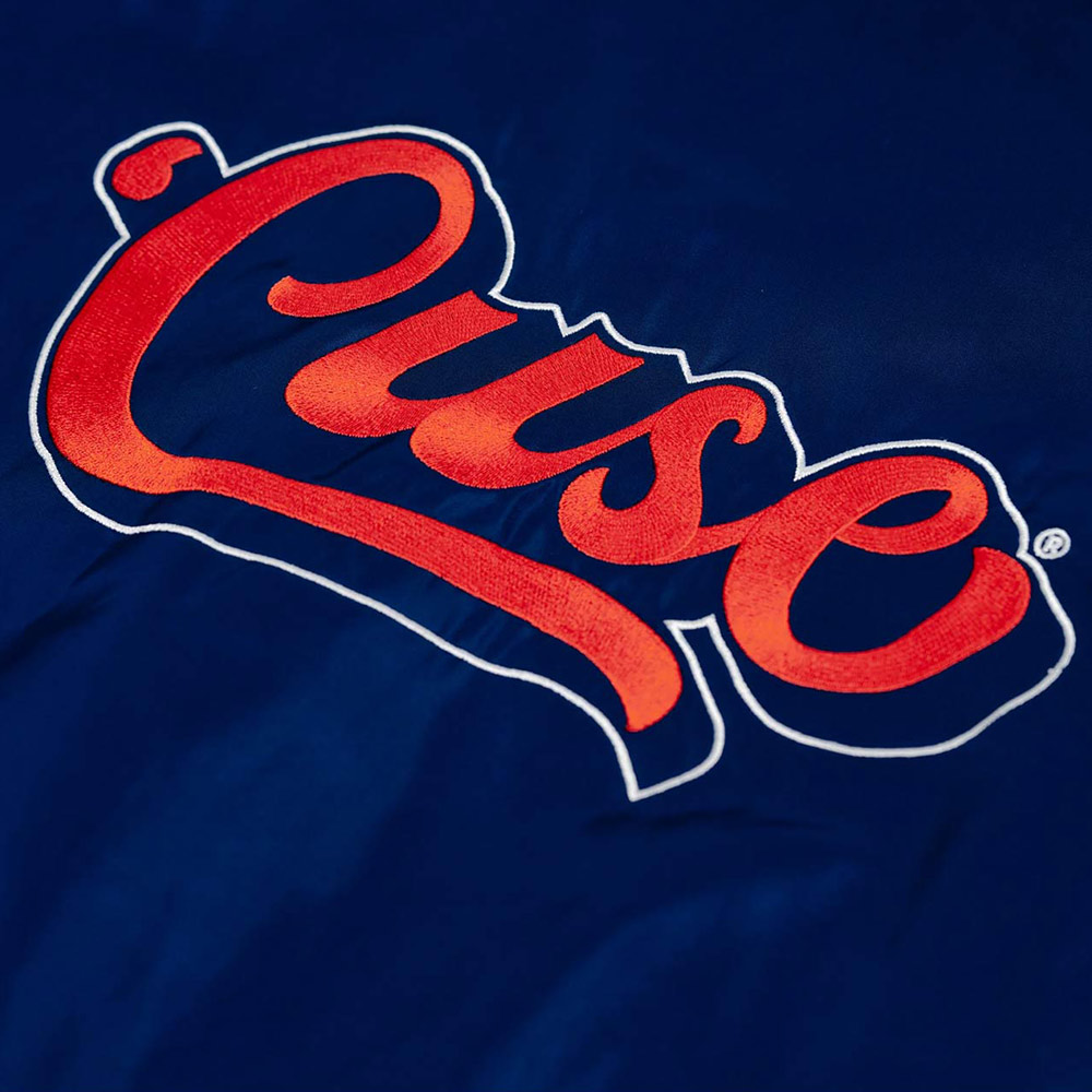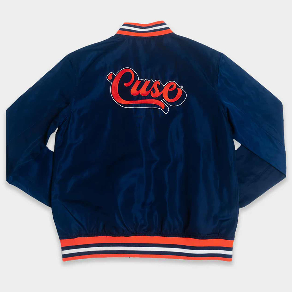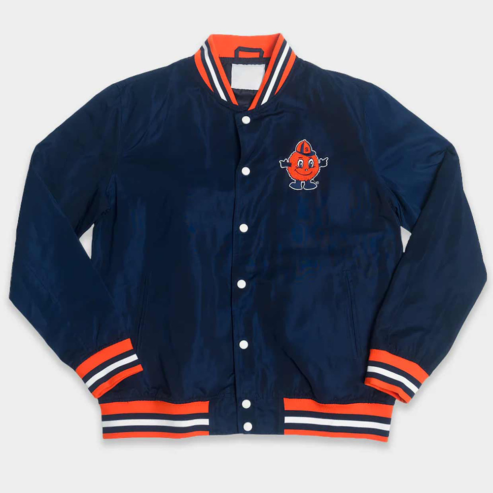 Elevate your style with our versatile Retro Otto Syracuse Orange Jacket, a unisex fashion statement designed for all genders. Crafted from luxurious satin material in a sophisticated navy blue hue, this jacket combines comfort and trendsetting aesthetics. The snap tab buttoned closure at the front ensures a seamless look, complemented by the rib-knitted striped collar, cuffs, and waistband for a sporty touch. The fine stitching attests to the jacket’s quality craftsmanship, while the two waist pockets add practicality to this fashionable ensemble. Adorned with the iconic Syracuse Orange and Otto logos on the front and back, this jacket seamlessly merges school spirit with contemporary style. Whether you’re cheering on the team or making a fashion statement, the Syracuse Orange Retro Otto Jacket is the perfect blend of comfort, sophistication, and team pride for any wardrobe.