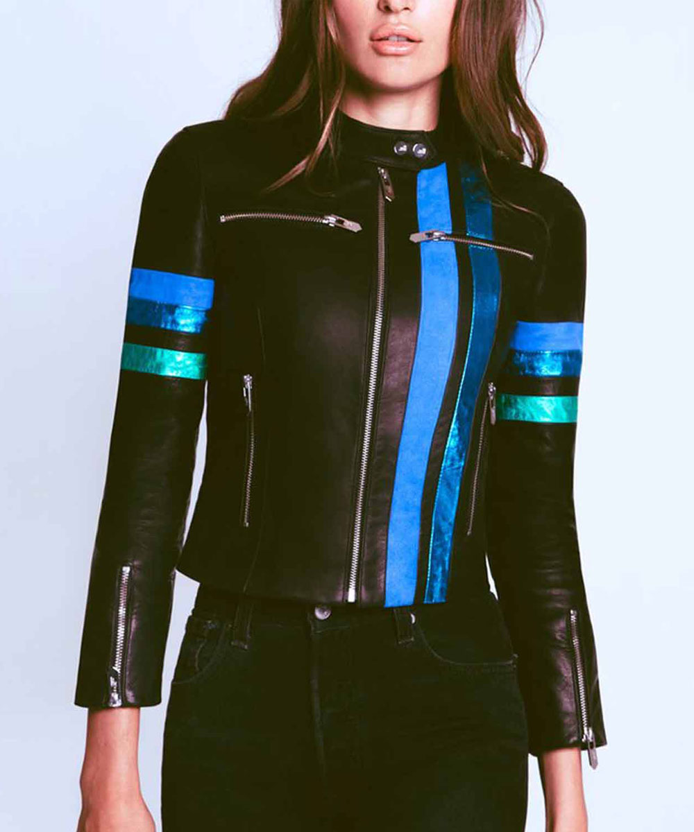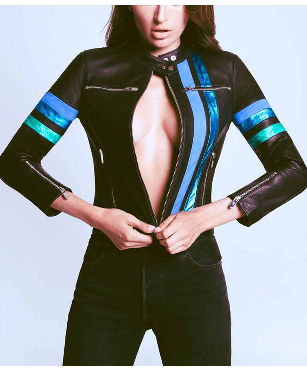 The Sam Swift Leather Jacket is made from high-quality genuine leather. The Jacket is available in a mesmerizing black color with blue vertical stripes at the front, which gives it an innovative and enchanted look. The Take-Two Rachel Bilson Jacket sleeves are long and fitted with stylish zipper cuffs and blue stripes on the upper arms. A soft viscose inner lining of the Jacket keeps you warm and relaxed. The collar of the Take-Two Rachel Bilson Jacket is a stylish snap tab. It has a branded YKK front zipper closure. The Jacket has two chest zipper pockets and two side waist zipper pockets for keeping stuff. The fine quality stitching of the Sam Swift Leather Jacket makes it durable and desirable to wear. The Jacket is ideal for a night out with friends.