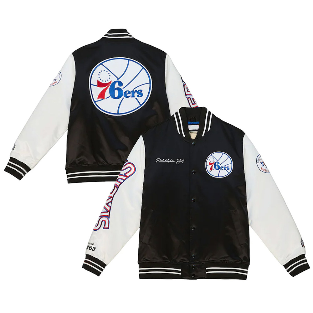 Philadelphia 76ers Team Origins Black/White Varsity Full-Snap Satin Jacket