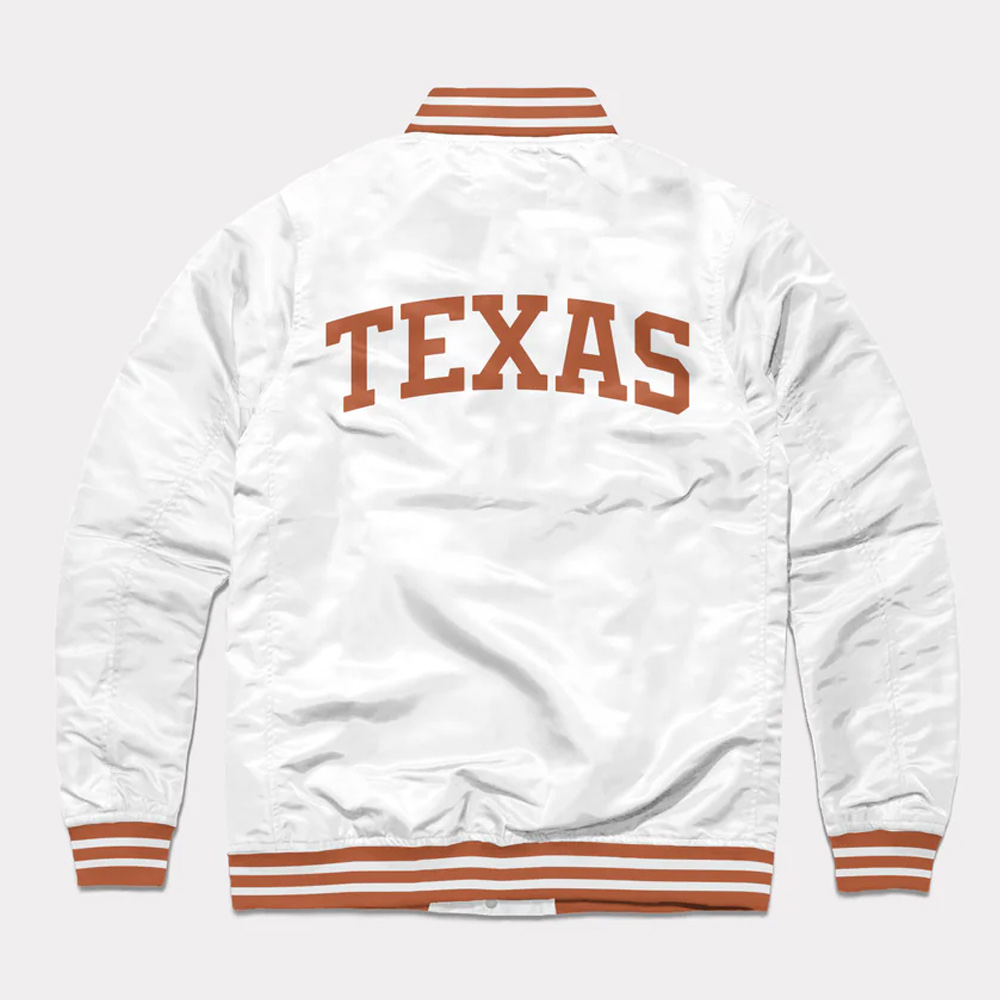 It is made from satin material and is designed to be worn by both men and women. The ribbed collar gives it a traditional look and the snap tab closure at the front means that it is easy to get on and off. The Texas Longhorns White varsity satin Jacket is great for throwing over your favorite team jersey or for wearing with a pair of jeans or leggings.