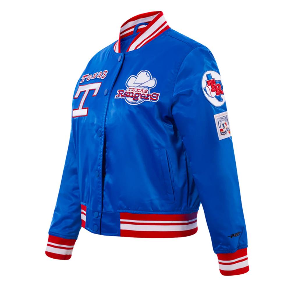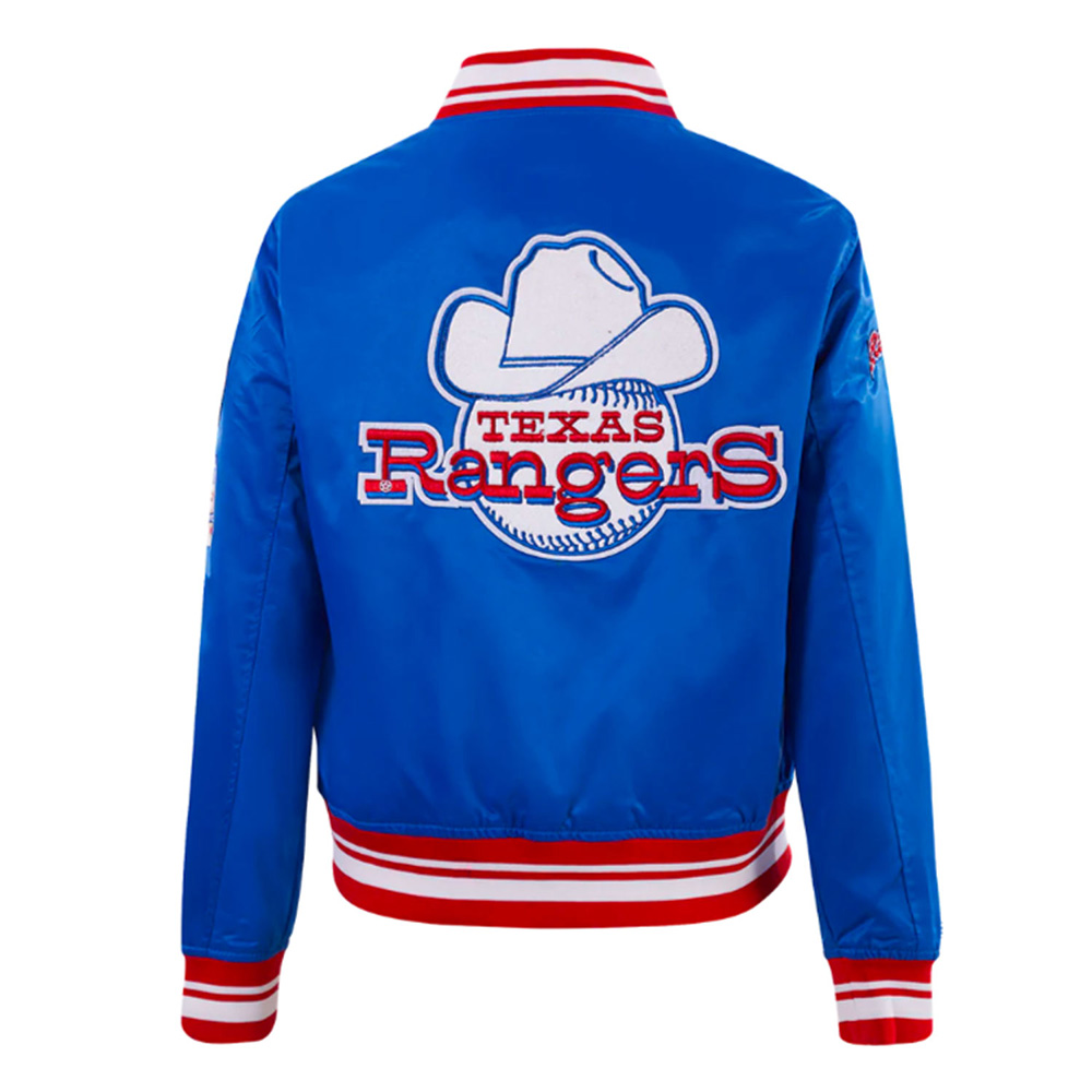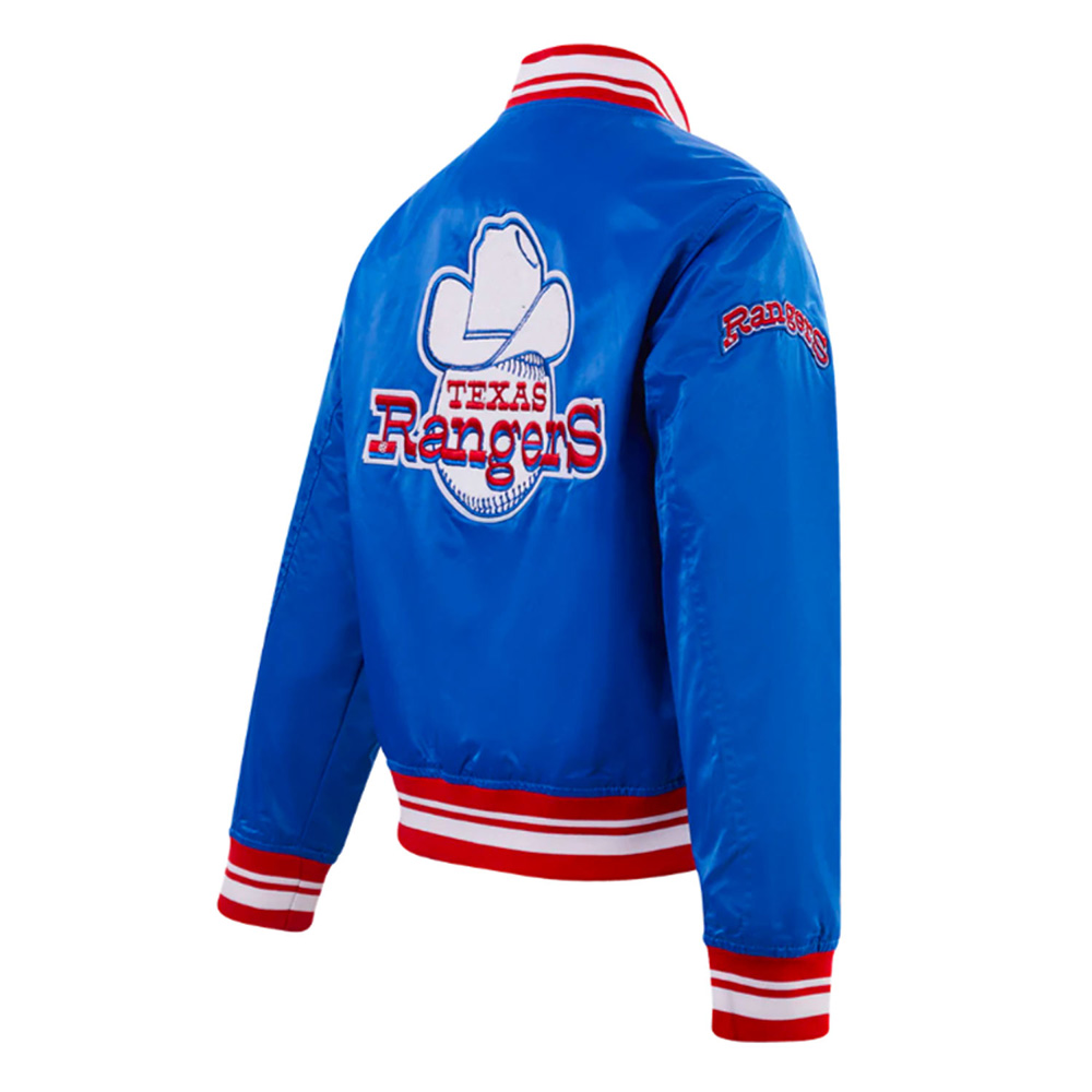 But what truly sets this jacket apart is the emblem of valor, the Texas Rangers logo proudly emblazoned on the front, sleeve, and back, a nod to tradition and a celebration of heritage. So, whether you’re wandering the bustling streets of the urban jungle or basking in the tranquility of the countryside, let our Texas Rangers Retro Classic Rib Royal Satin Jacket be your loyal companion, a beacon of elegance in a world of fleeting trends.