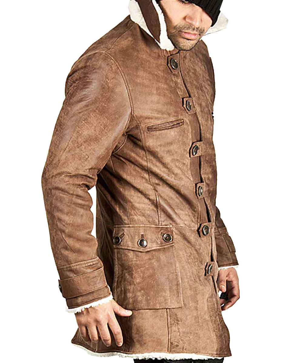 The Bane Shearling Coat is made from high-quality genuine distressed leather, giving it a rugged yet luxurious finish. The majestic brown color enhances its bold appearance. Inside, a soft faux shearling lining ensures warmth and comfort during colder seasons. The lapel-style collar and double-breasted button closure complete its classic look.