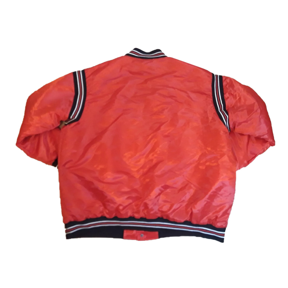 Made from satin and is lined with viscose to provide a soft and comfortable feel. The striking red color reflects the spirit of the Atlanta Hawks basketball team and ribbed collar, cuffs and hemline give it a sporty fit. The snap tab closure of “The Enforcer”Atlanta Hawks retro red jacket enhances usability while you are able to look elegant and comfortable.