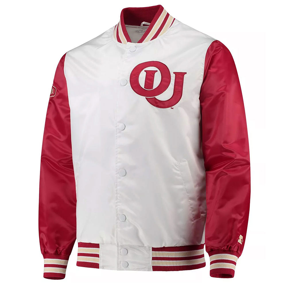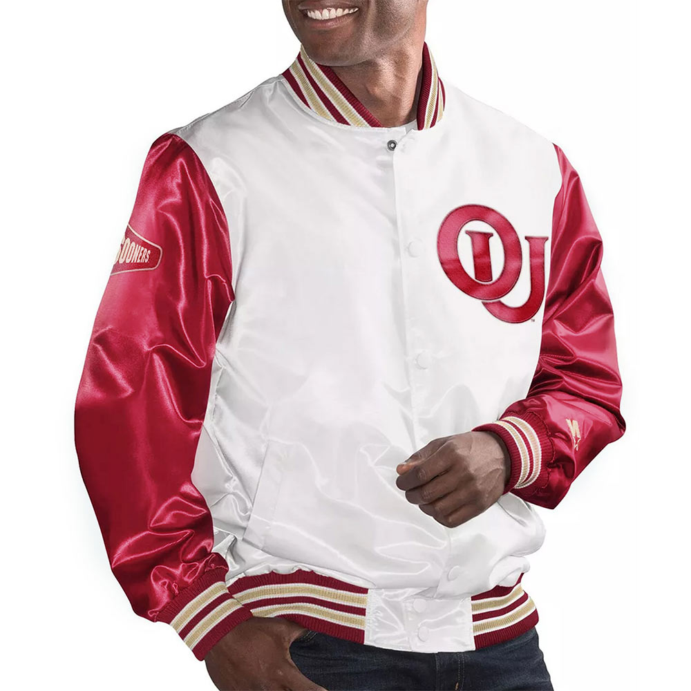 Releasing the Legend Oklahoma Sooners White And Crimson Jacket, meticulously crafted from luxurious satin. Presented in a magnificent combo of white and red, this jacket exudes a chic and stylish allure. The Legend Oklahoma Sooners Jacket features a rib-knitted collar and a front buttoned closure, seamlessly blending convenience and class. Adorned with logos on the chest, sleeves, and back, it attains an inimitable identity. Wrapped in a gentle viscose lining, the inner haven envelops you in comfort. The elongated, well-fitted sleeves, coupled with rib-knitted cuffs, promise a sleek silhouette. For functionality and allure, two side waist pockets elegantly integrate utility. Impeccable stitching ensures the jacket’s enduring quality. A favored choice for a night out, the Legend Oklahoma Sooners White And Crimson Jacket stands as a symbol of sophisticated taste, embraced by both stylish men and women.