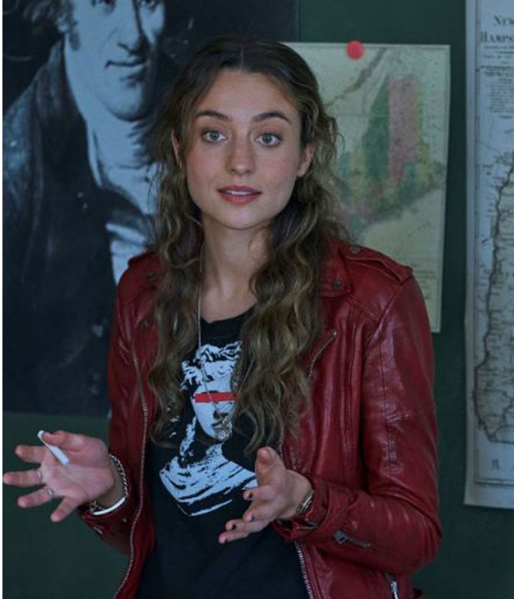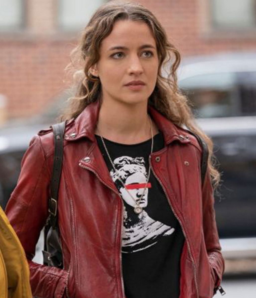 The Sarah Cooper red leather jacket is made from high-quality genuine leather. The jacket is available in glorious red color, which gives it an innovative and eye-catching look. The collar of the jacket is notch lapel style. It has a branded YKK front zipper closure. A soft viscose inner lining of the jacket keeps you warm and relaxed. The sleeves of the Stella Baker the Republic of Sarah red leather jacket are long buckled strap ends with zipper cuffs. The jacket has two vertical zippered waist pockets and two pockets inside for keeping stuff. The fine quality stitching of the Sarah Cooper red leather jacket makes it durable and desirable to wear. The jacket is an ideal choice for stylish women.