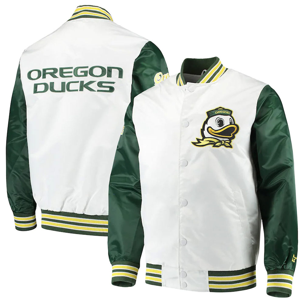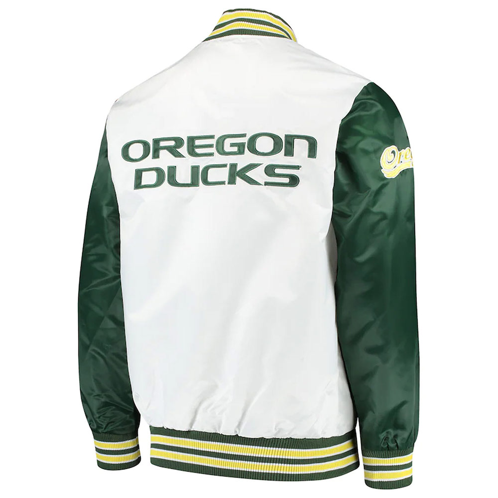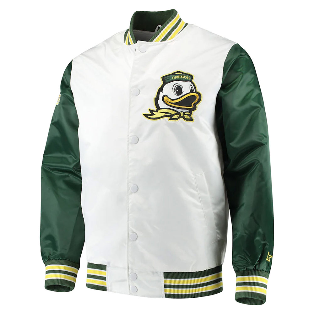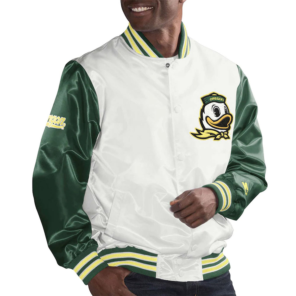 From game-day excitement to everyday wear, the Starter White and Green Oregon Ducks The Rookie Satin Jacket is versatile enough to fit any setting. Its fine stitching ensures long-lasting durability, making it a must-have for both collectors and die-hard fans.