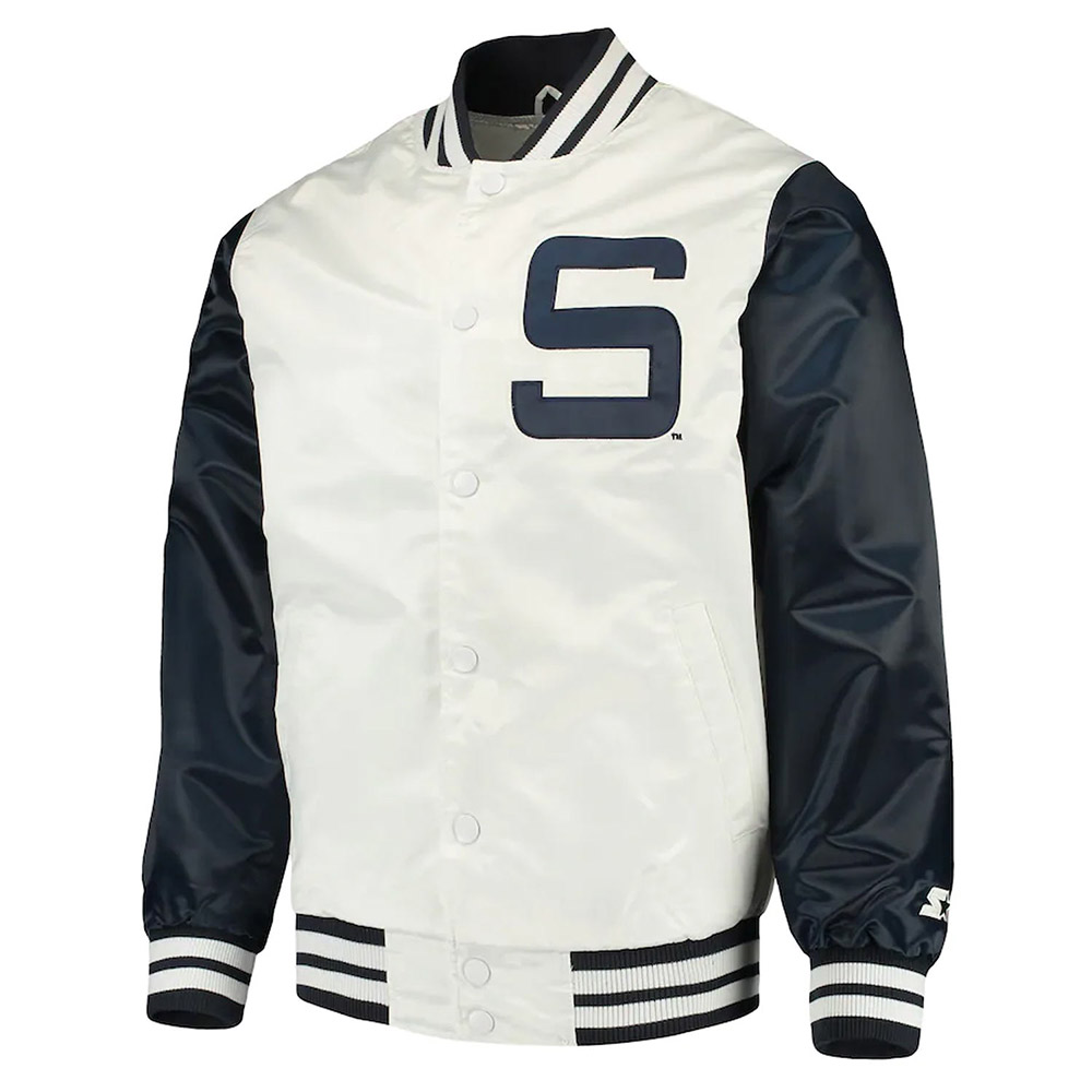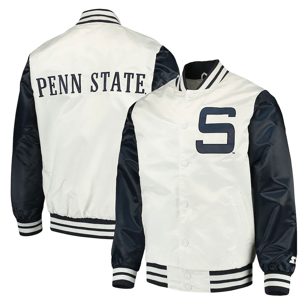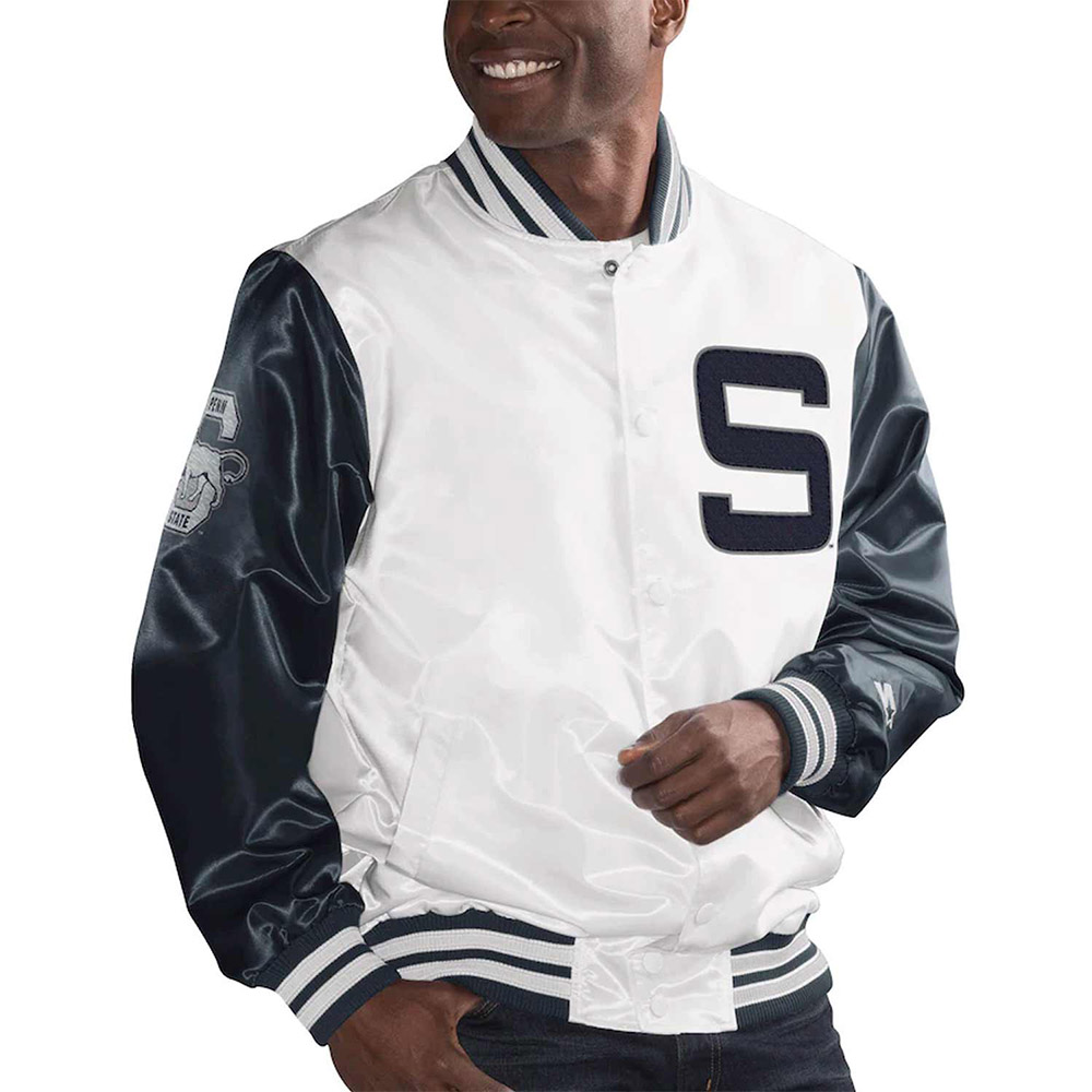 The Penn State Nittany Lions the Rookie jacket is made up of high-quality satin. The jacket is available in a glorious blue and white color combination, which gives it an innovative and striking look. The jacket has shirt style collar. The jacket has branded YKK zipper front closure. A soft inner viscose lining of the jacket keeps you warm and relaxed. The sleeves of Rookie Penn State Nittany Lions Blue and White Satin jacket are long with rib knitted cuffs. The jacket has two inner and two side pockets. The fine quality stitching of Penn State Nittany Lions the Rookie jacket is comfortable and desirable to wear. The jacket is an ideal choice to wear in parties.