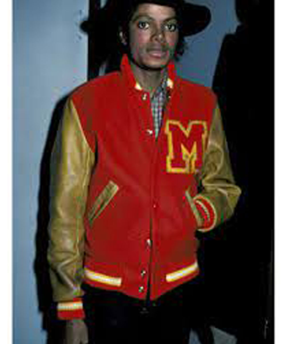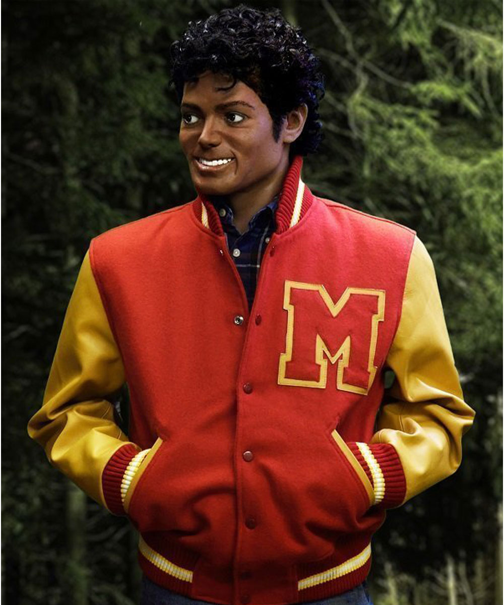 The bold red-and-yellow color combination makes this thriller jacket instantly recognizable. Designed with a classic varsity cut, it features a rib-knitted collar, cuffs, and hemline in red and white that highlight its retro appeal. The jacket is lined with soft viscose fabric, ensuring all-day comfort while maintaining a structured fit. With a front button closure, it offers ease of wear, while two side waist pockets and two inner pockets provide practical storage. The signature “M” patch embroidered on the chest adds authenticity and completes the star-inspired design.