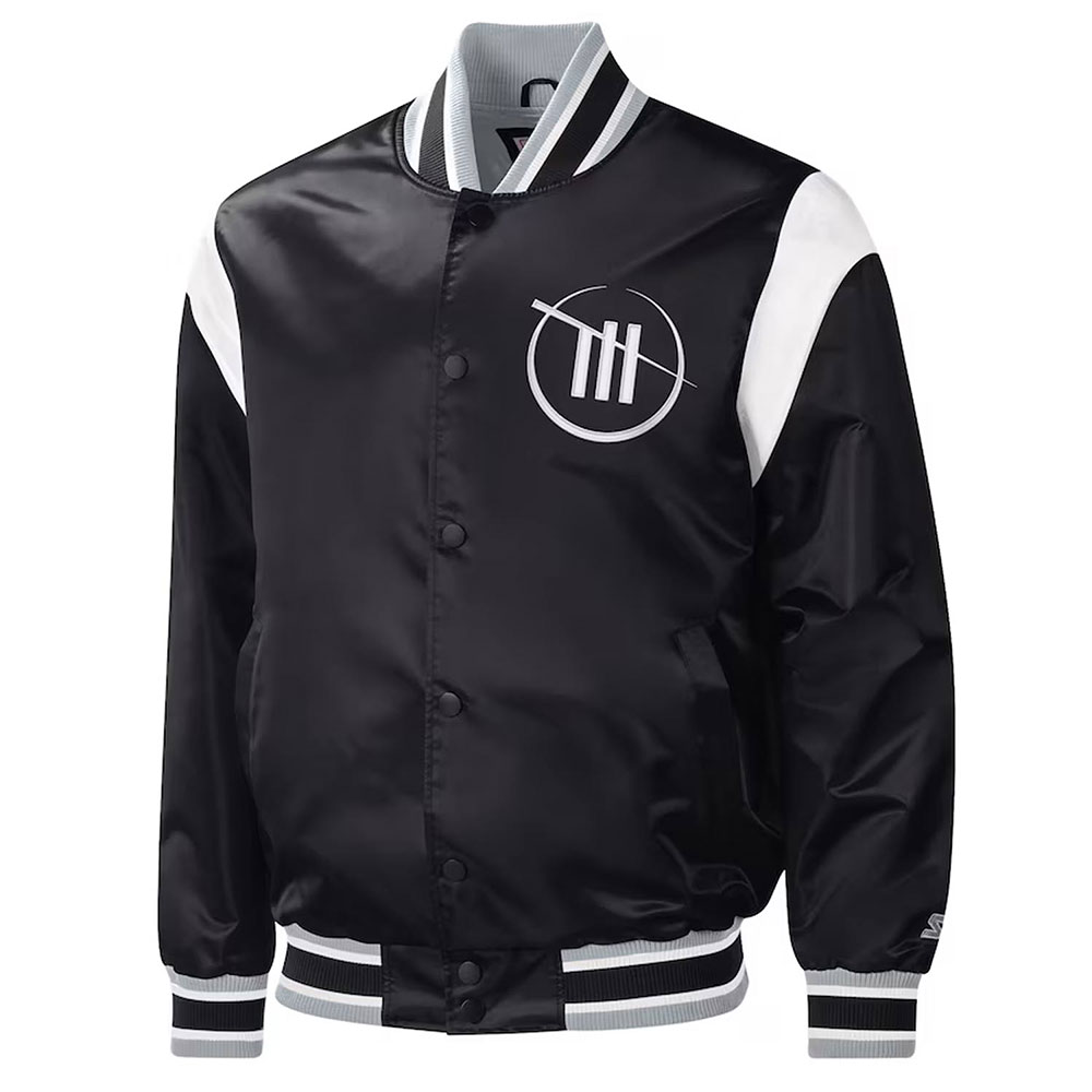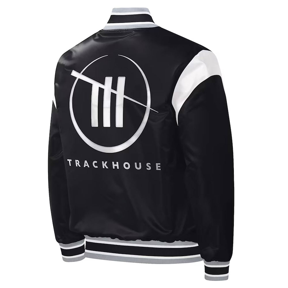 Engage in the realm of sports and style with finesse through Trackhouse Racing Force Play jacket. Crafted meticulously from exquisite satin, it showcases an enticing black and white color that radiates individuality. The rib-knitted style collar and the snap-tab buttoned closure intertwine harmoniously, ensuring a seamless marriage of elegance and confidence. Its unique design makes a resounding statement, making it an impeccable choice for animated evenings with friends. The elongated sleeves of the Trackhouse Racing Force Play black varsity satin jacket are adorned with rib-knitted cuffs, strike the perfect balance between comfort and audacity. Wrapped in the plush cocoon of a viscose inner lining, warmth and serenity become your eternal companions. Meanwhile, functional waist zipper pockets and concealed inner compartments add a dash of practical elegance to house your essentials.