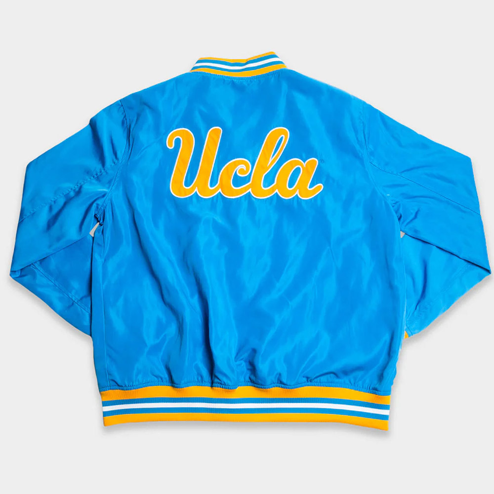 Show your undying support for the mighty UCLA Bruins in this Script UCLA Joe Bruin Bomber jacket, inspired by the UCLA football team. This timeless piece of apparel is a must-have for any fan or enthusiast. Crafted with fine quality satin. The highlight of this UCLA Joe Bruin Light Blue Script jacket is the eye-catching UCLA Bruins logo embroidered on the chest and back, showcasing your team pride. The rib-knitted collar, cuffs, and hemline add a touch of sophistication, while the snap tab buttoned front closure allows for adjustability and comfort. The jacket also comes with two outside pockets, perfect for storing your essentials, this Script UCLA Joe Bruin Bomber jacket is designed to keep you warm and stylish during chilly games or cooler nights.