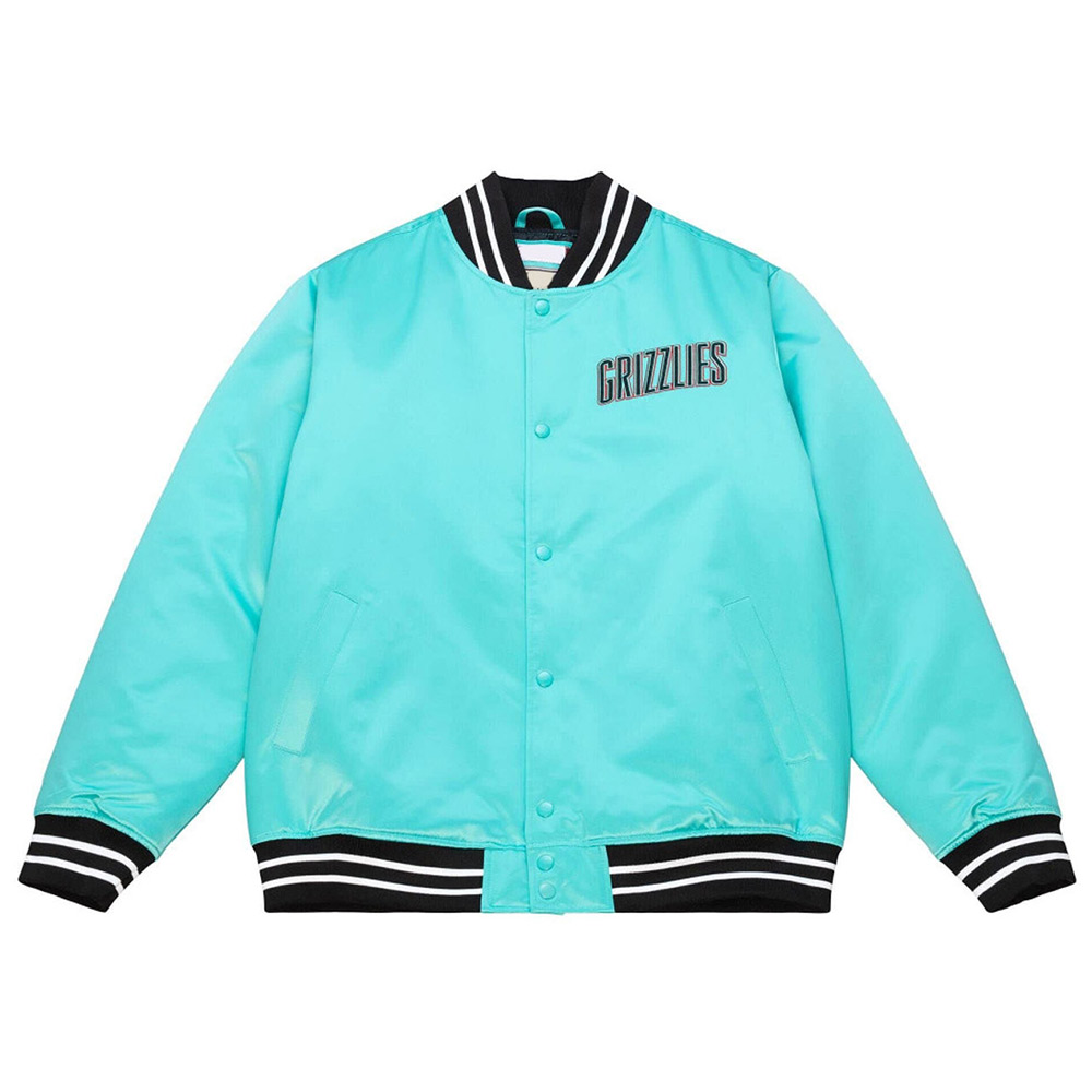 Experience the Vancouver Grizzlies Heavyweight Bomber jacket crafted from satin for a premium feel. Glorious sky blue color combo for an innovative and attractive look. Rib-knitted collar adds a touch of style. Buttoned front closure for easy wear. Stay warm and relaxed with the soft inner viscose lining. Long sleeves with buttoned cuffs exude sophistication. Two inner and two side pockets for convenience. Fine quality stitching of Vancouver Grizzlies Heavyweight Aqua Satin jacket ensures durability and desirability. Stand out at parties with this unique and catchy jacket. Embrace the perfect blend of style and comfort while maintaining its length for an impeccable fit. Make a statement with the Memphis Grizzlies Varsity Navy and White jacket.
