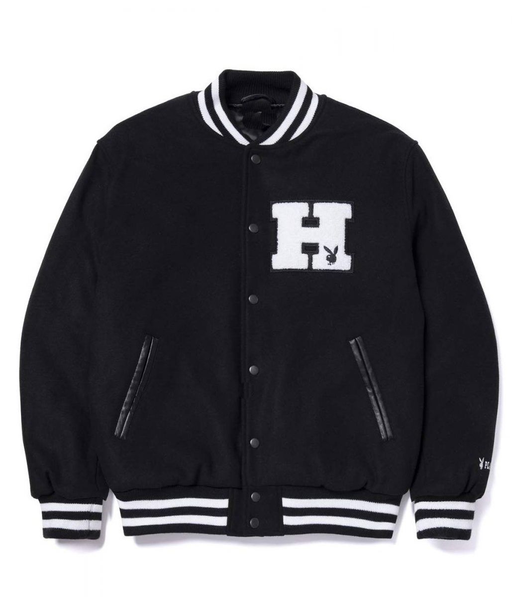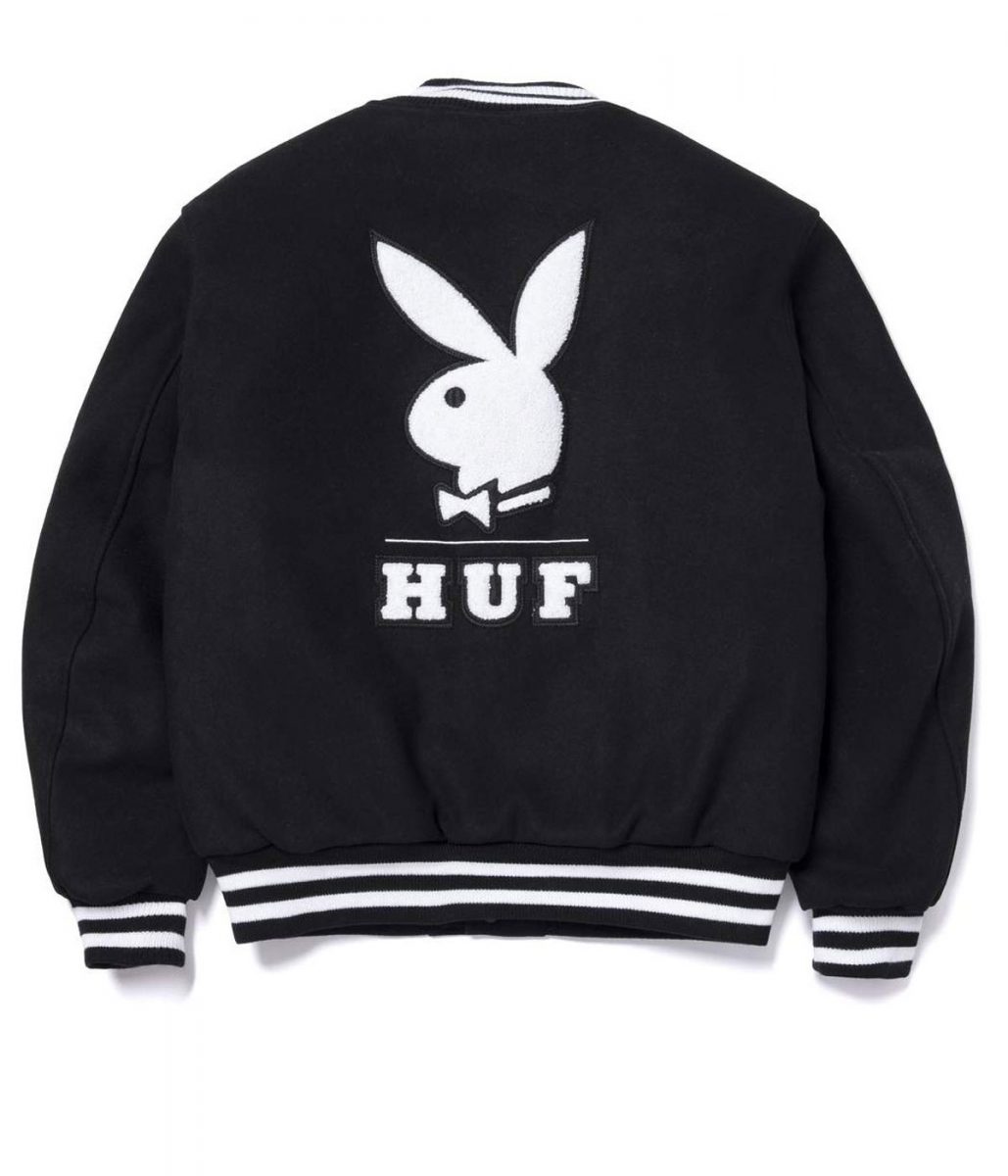 The Huf Playboy varsity jacket is made from high-quality wool. The jacket is available in a mesmerizing black color, which gives it an innovative and mysterious look. The collar of the jacket is a rib-knitted style. It has a classic snap tab buttoned front closure. A soft viscose inner lining of the jacket keeps you warm and relaxed. The sleeves of the Huf X Playboy black varsity jacket are full-length ends with rib-knitted cuffs. The jacket has two side waist pockets for keeping stuff. The jacket has “Huf” logo on the back of the jacket. The fine quality stitching of the Huf Playboy varsity jacket makes it durable and comfortable to wear. The jacket is an ideal choice for stylish men.
