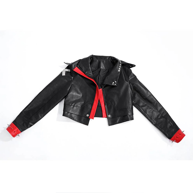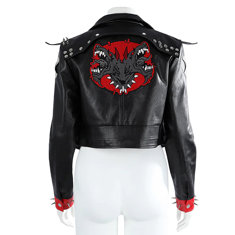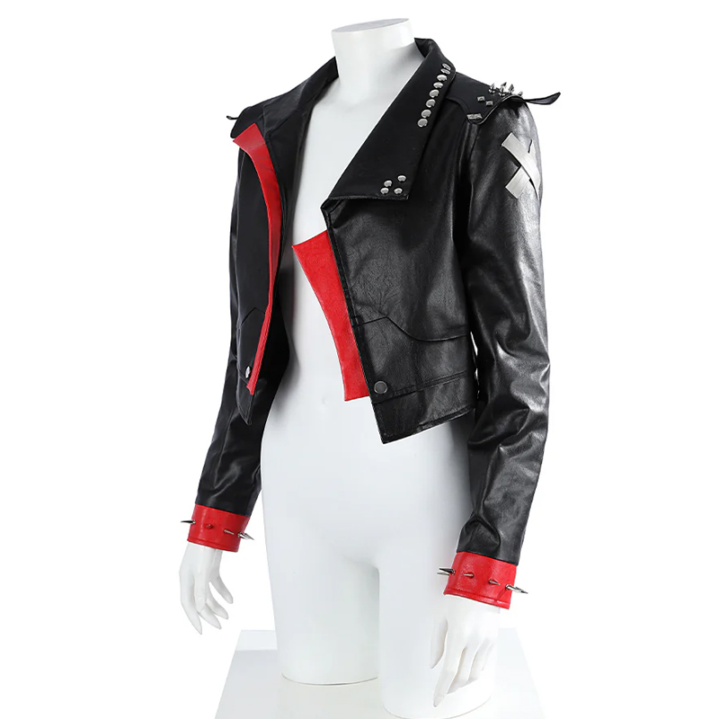 The Arcane VI Leather Jacket is crafted from genuine leather. Its sleek black color delivers a timeless edge, while the lapel collar and open front bring a modern touch. In addition, the bomber-style cut enhances comfort. Studded details at the shoulders, cuffs, and collar create a rebellious vibe that matches VI’s personality.