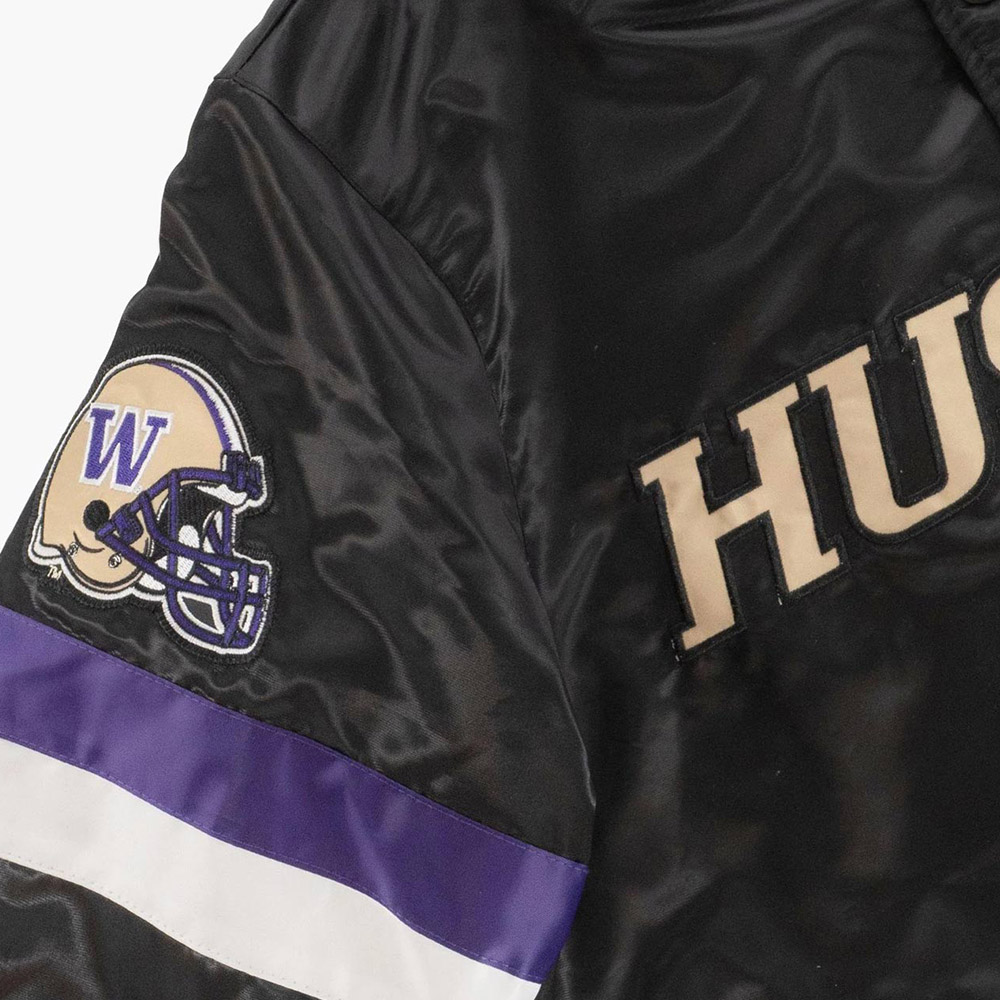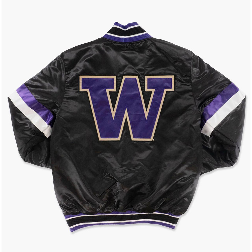 Experience the thrill of game day in style with our exclusive After Dark Washington Huskies jacket, inspired by the Washington Huskies football team and designed for passionate fans of all genders. Crafted from luxurious satin in a sleek black color, this jacket exudes sophistication while showcasing your unwavering support for your favorite team. The snap tab buttoned front closure ensures a secure fit, allowing you to cheer on the Huskies with confidence and ease. The rib-knitted collar, cuffs, and hemline add a classic touch to the design, providing both style and comfort throughout the game.