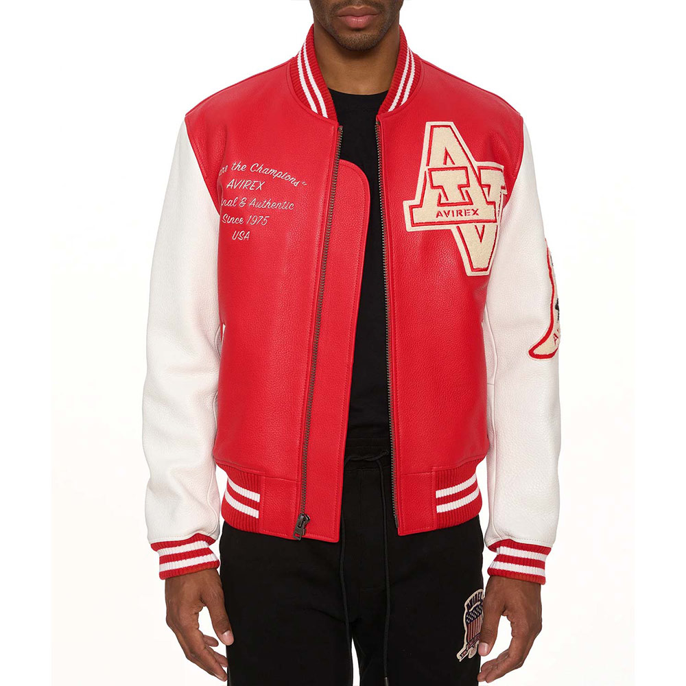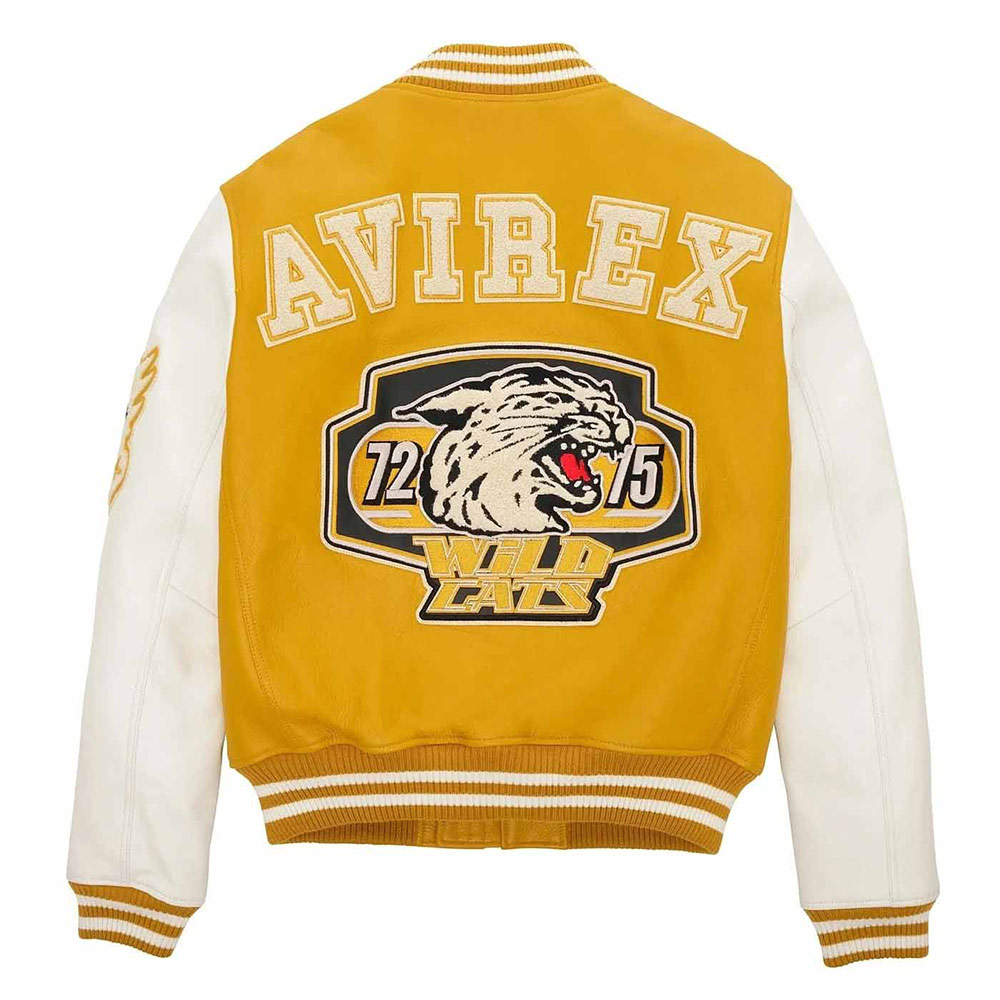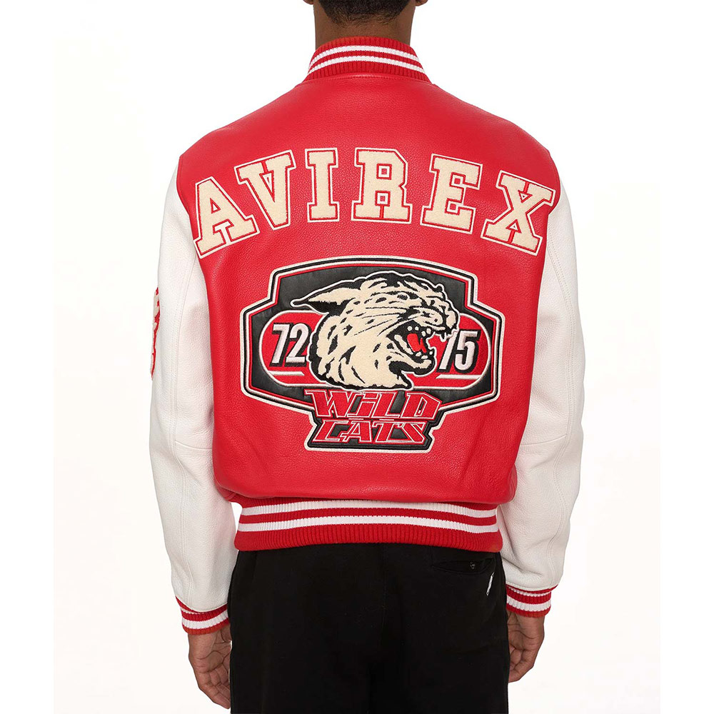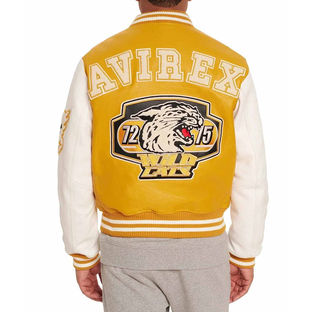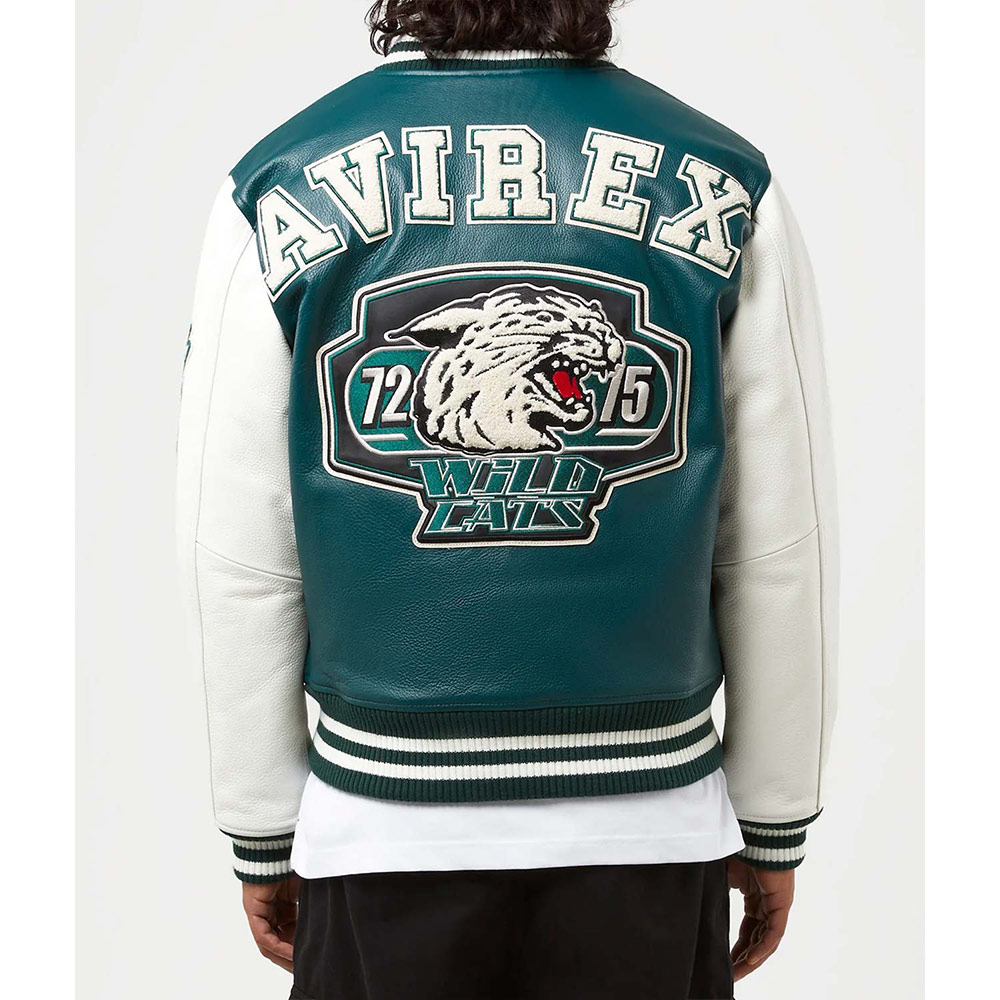 Turn heads with your alluring appearance with the Avirex Wildcat Varsity jacket made from genuine leather with a soft viscose lining inside offering comfort. This modern jacket is available in compelling color options that can enhance your charm and highlight edgy features like rib-knitted cuffs, collar, and hemline. The Avirex Wildcat Varsity leather jacket has a zipper fastening closure that provides unrestricted movement. Keep your stuff along with you anywhere you go with its two waist zipper pockets outside and inside pockets. Avirex Wildcat graphics on the front back and sleeve boost your gaming spirit.