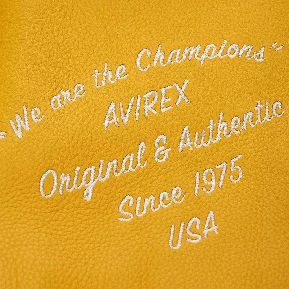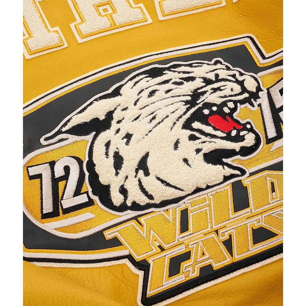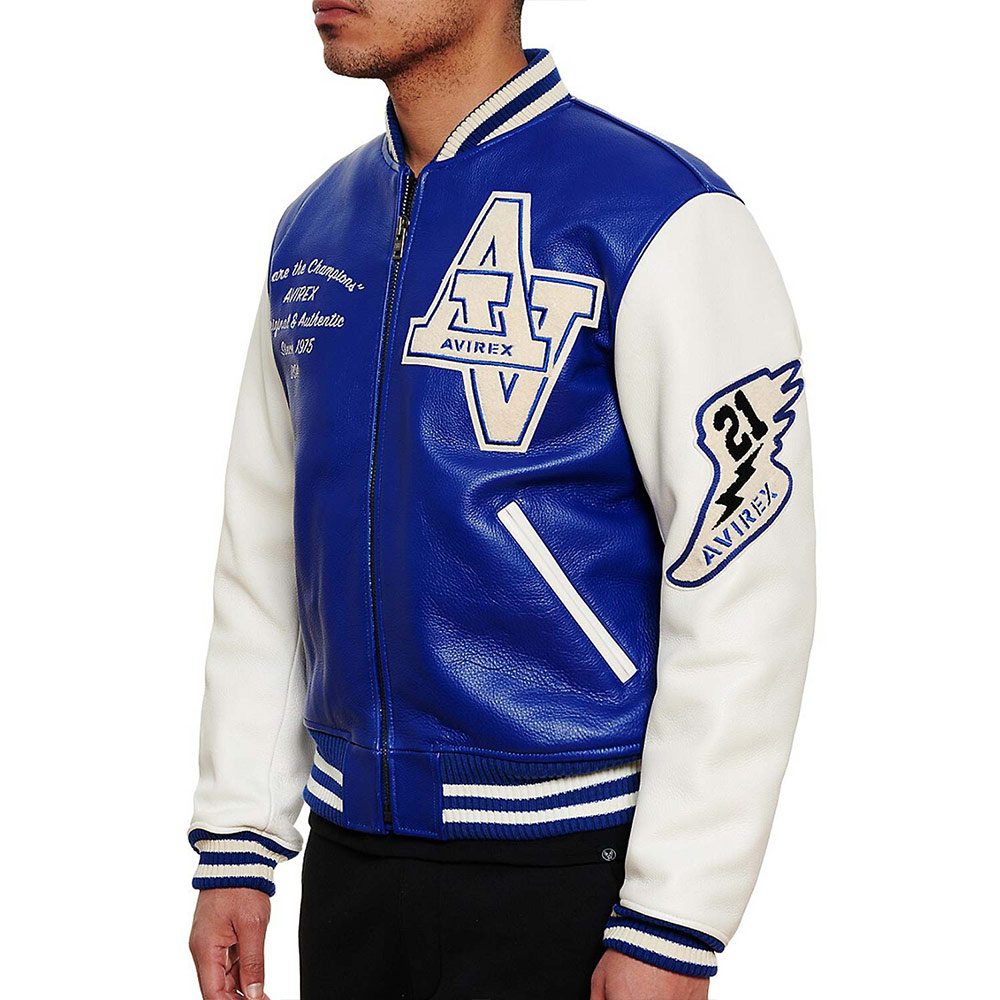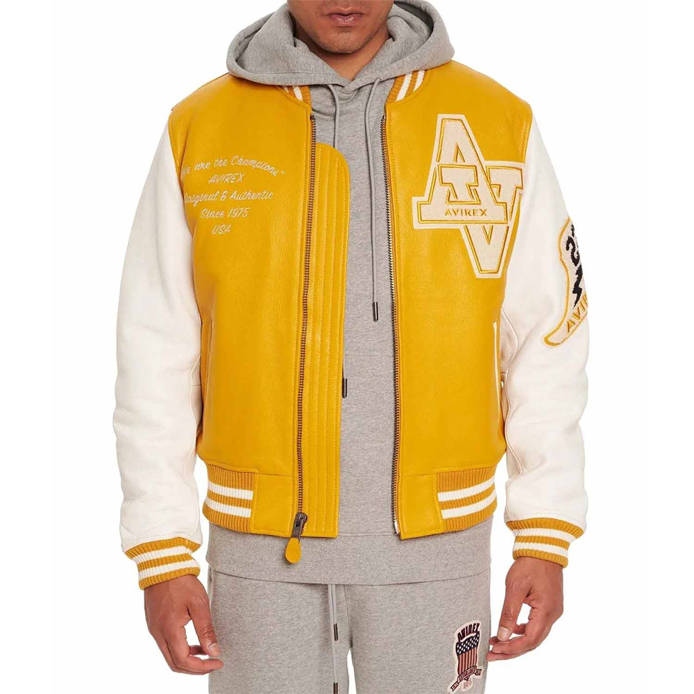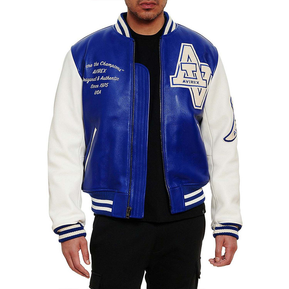 Turn heads with your alluring appearance with the Avirex Wildcat Varsity jacket made from genuine leather with a soft viscose lining inside offering comfort. This modern jacket is available in compelling color options that can enhance your charm and highlight edgy features like rib-knitted cuffs, collar, and hemline. The Avirex Wildcat Varsity leather jacket has a zipper fastening closure that provides unrestricted movement. Keep your stuff along with you anywhere you go with its two waist zipper pockets outside and inside pockets. Avirex Wildcat graphics on the front back and sleeve boost your gaming spirit.