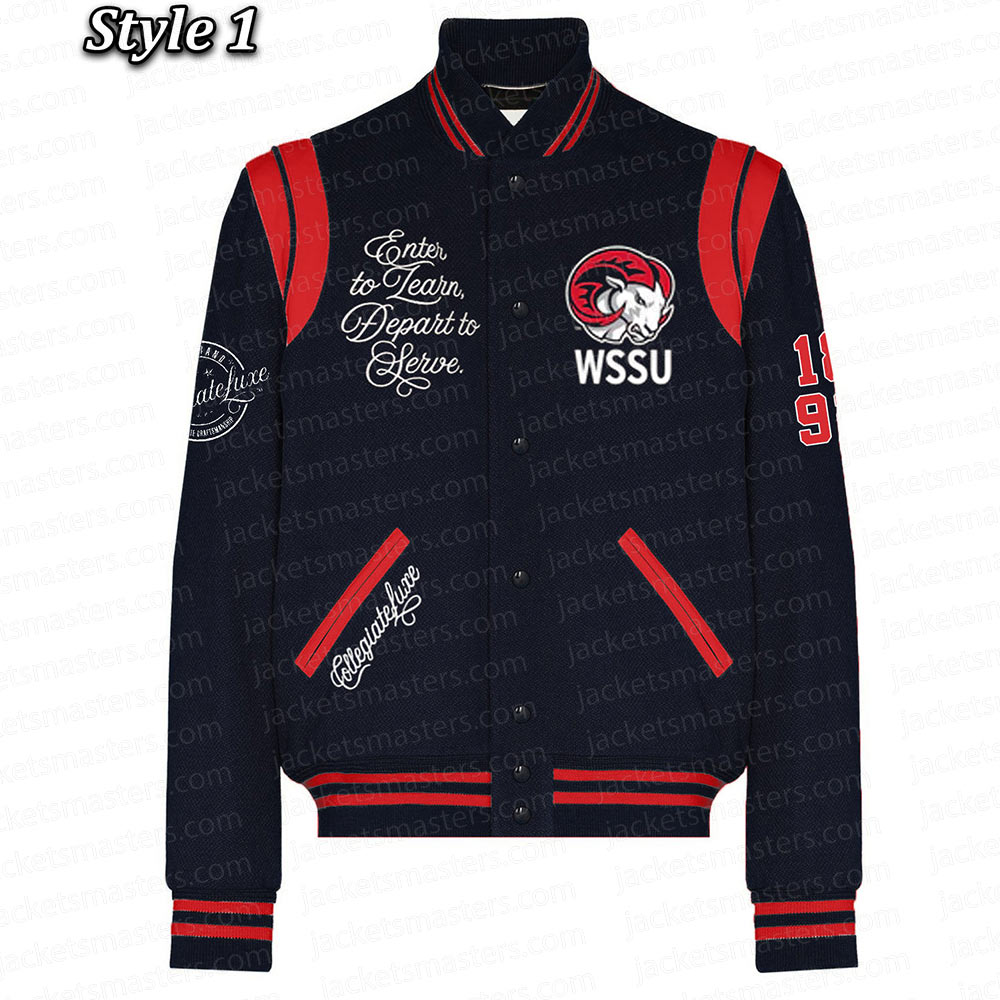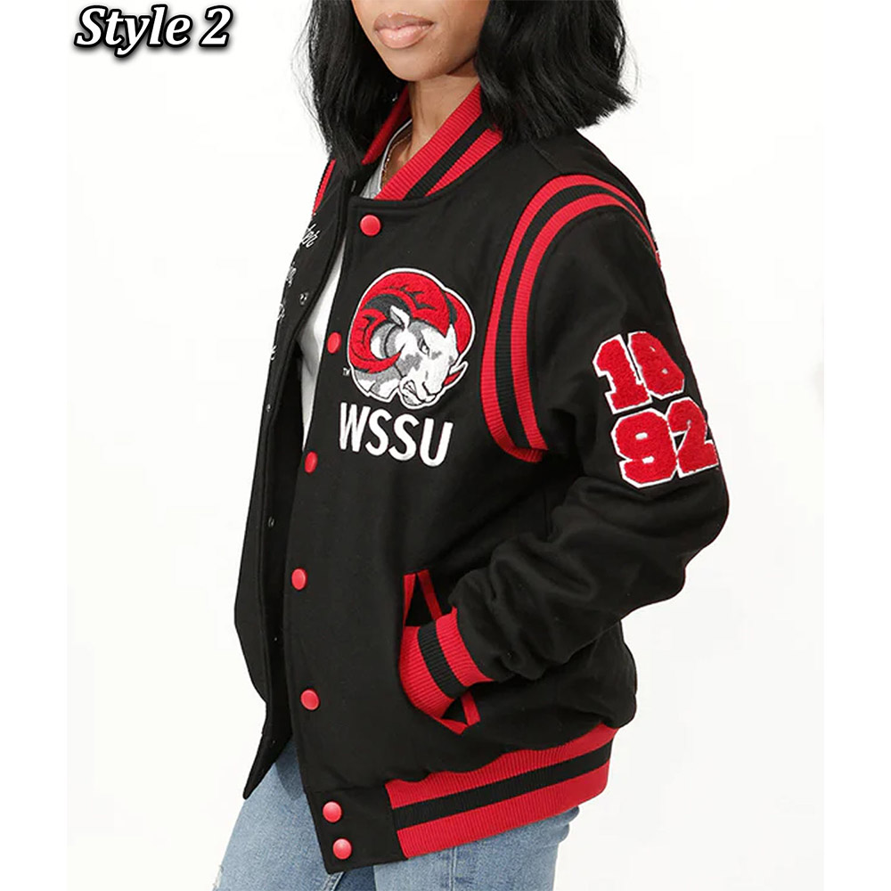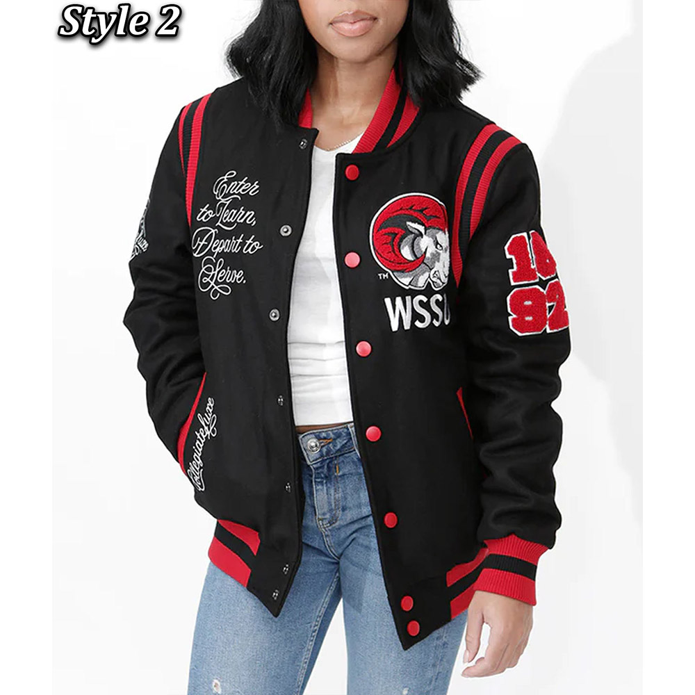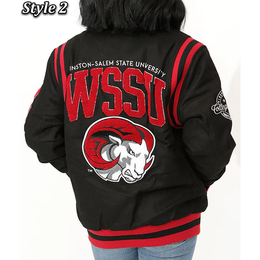 Immerse yourself in the heritage and pride of Winston-Salem State with the WSSU Black Varsity Wool Jacket. Crafted with meticulous artistry, the blend of plush wool and genuine leather sleeves creates an aura of luxurious comfort and enduring quality. The classic black hue serves as a canvas for the Winston-Salem State legacy, reflecting the journey of champions. The rib-knit collar and full-snap front closure offer a fusion of elegance and practicality, while the rib-knit cuffs and hemline add an exquisite finish. Adorned proudly with the Winston-Salem State emblem, this jacket becomes a testament to devotion and camaraderie. Designed for all genders, it embodies the spirit of unity and excellence that defines Winston-Salem State.